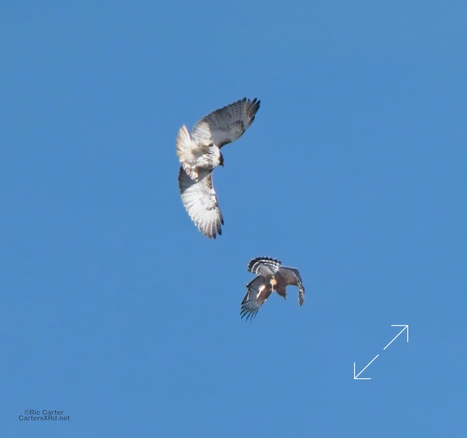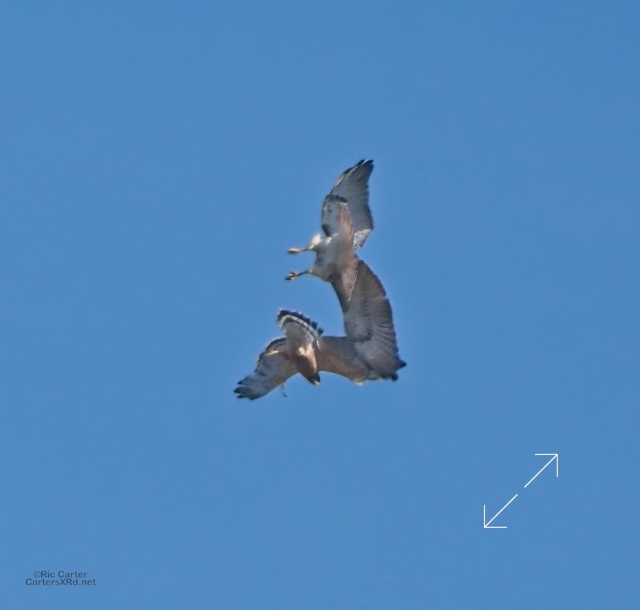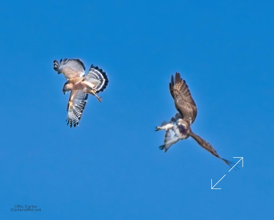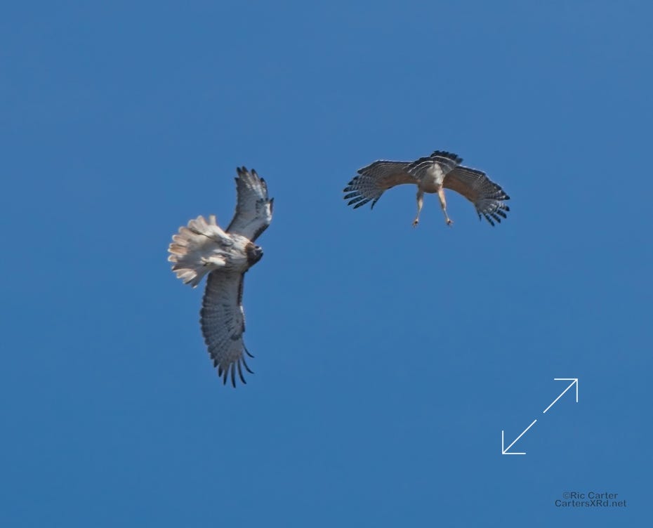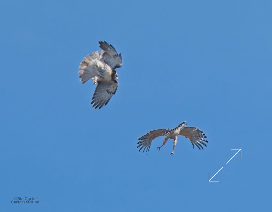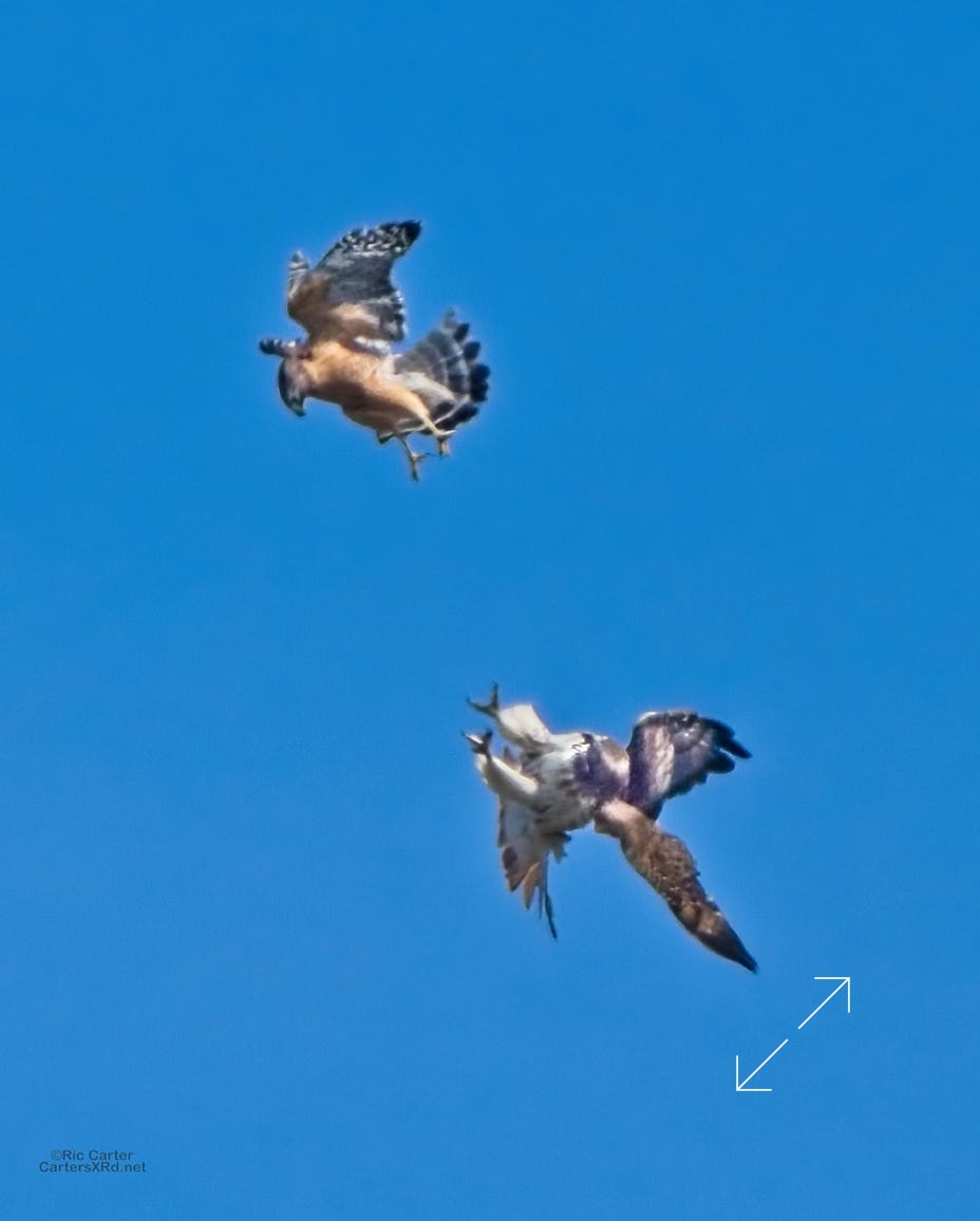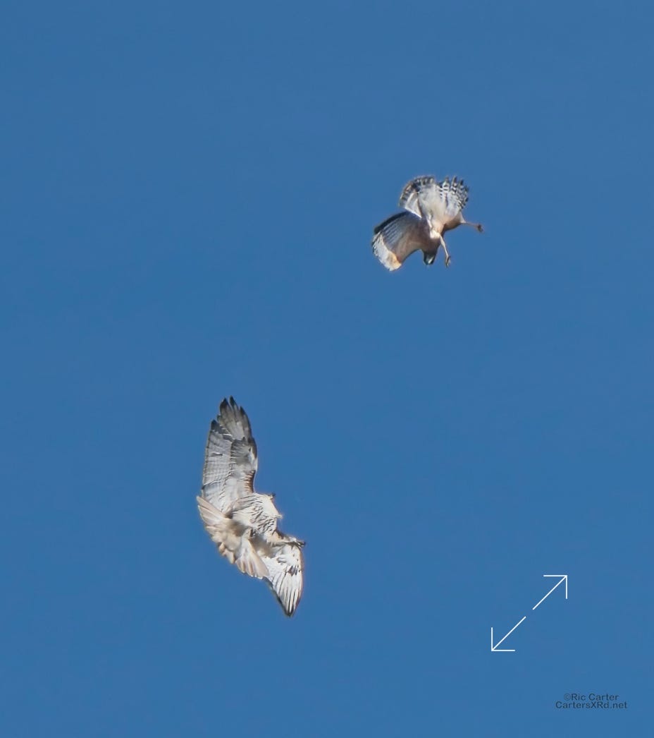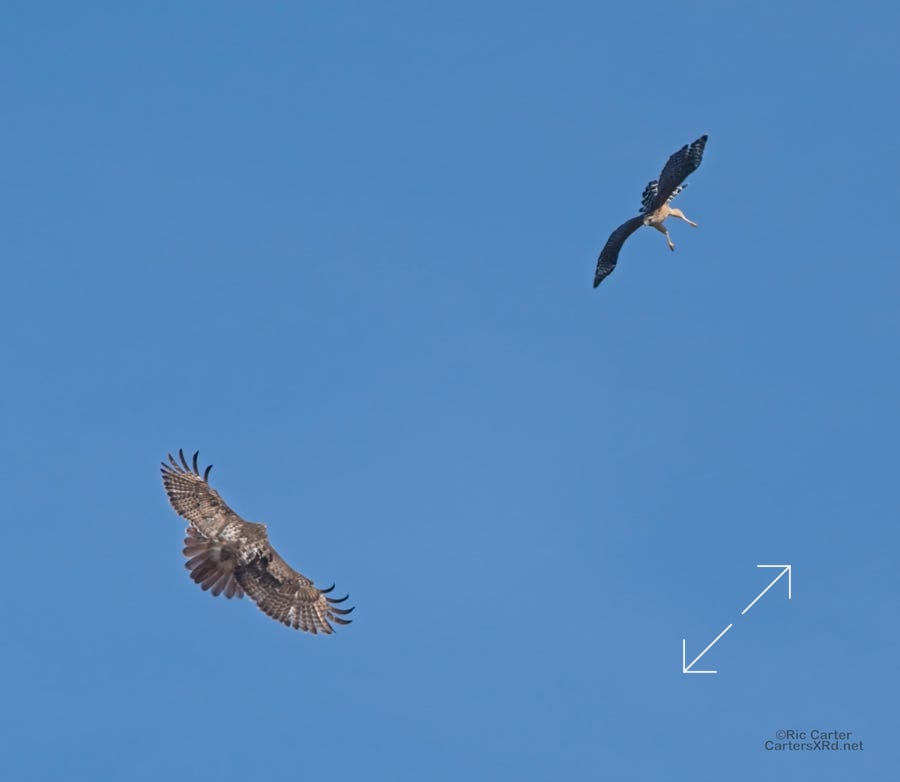 I was going to practice drone flying the other day. As I stopped the car and was getting unpacked, I noticed a low flying red-tailed hawk headed toward me. I immediately decided not to fly drone (you just DO NOT fly drones around birds) and grabbed the telephoto in hopes of getting a few pictures of him (see Birds of Prey Week 6). He was not far past me when I heard a hawk cry. It was not him. There was a red-shouldered hawk approaching from the opposite direction. They were clearly working out the open field territory dominance there. I expect they will be taking turns as they have for the last few years. I wish these were sharper, but the action takes place 500-900 meters away and I had to work hand-held.