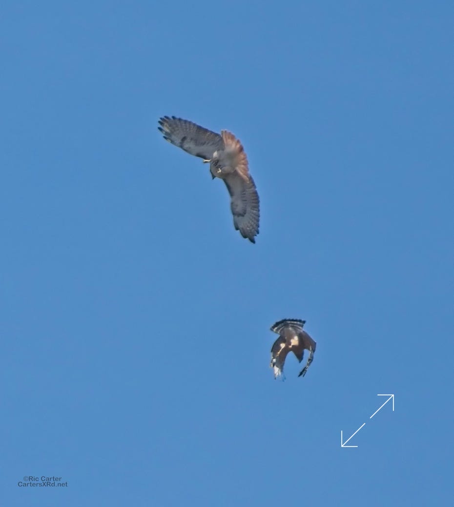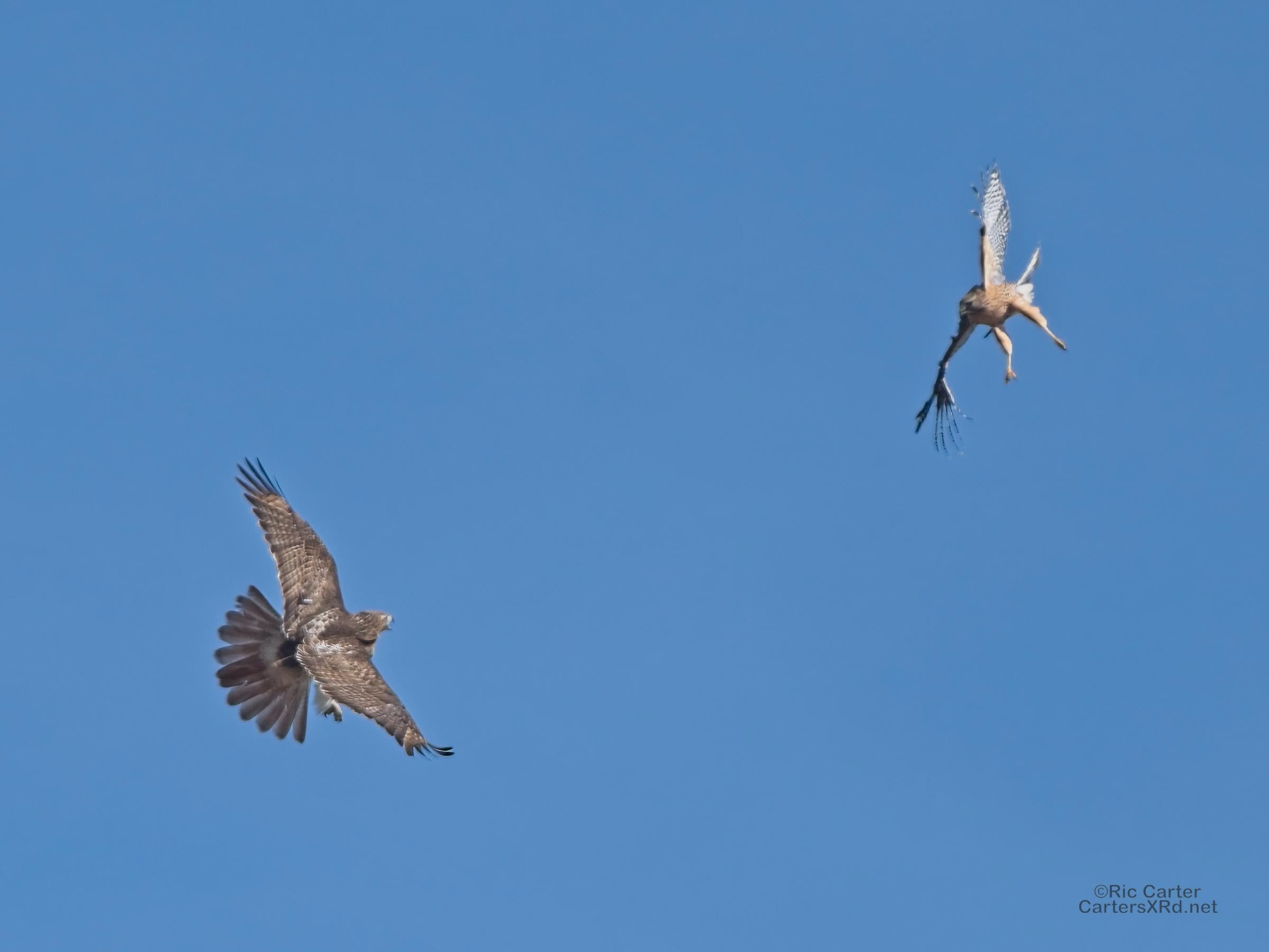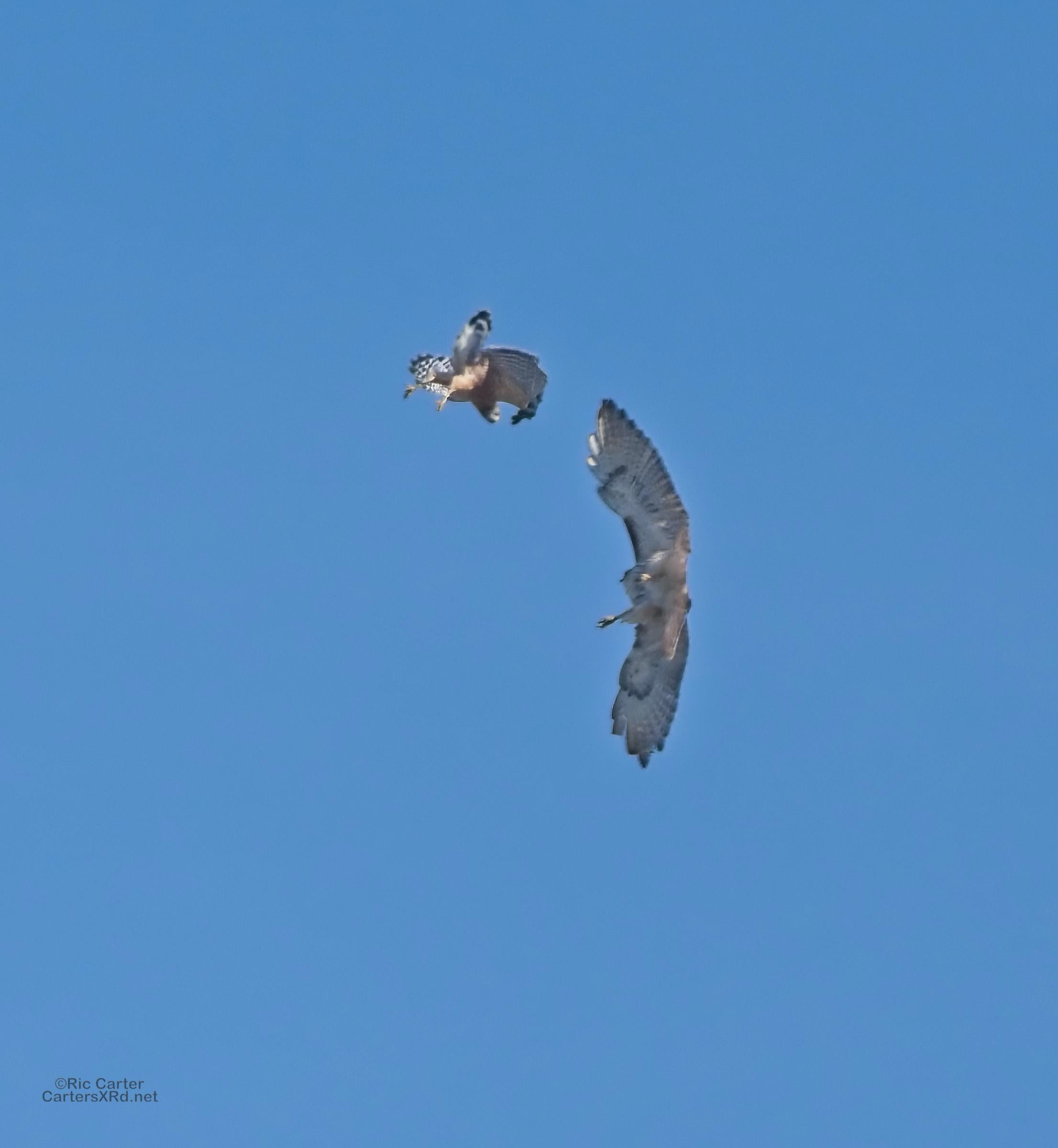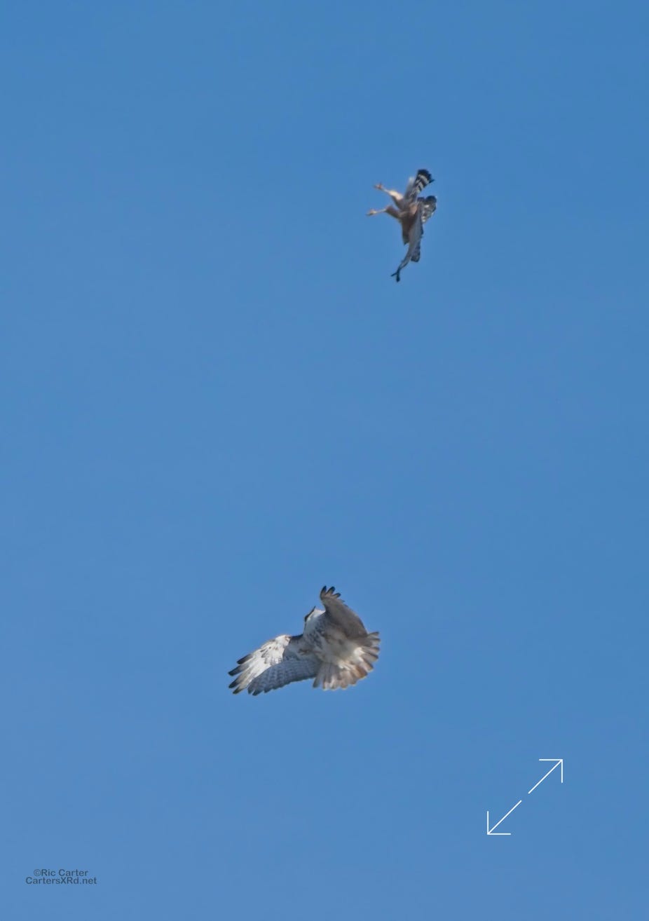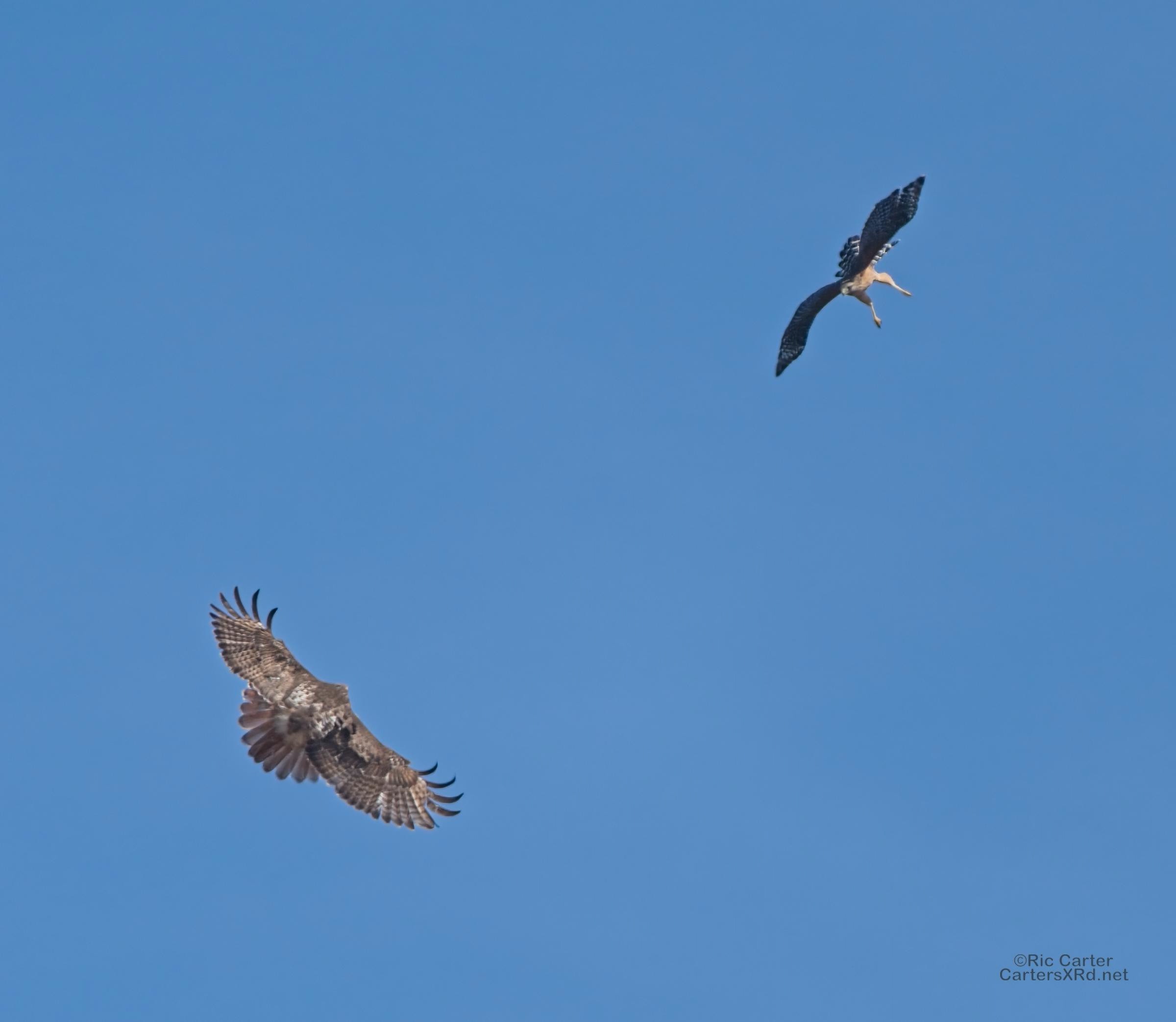 I was going to practice drone flying the other day. As I stopped the car and was getting unpacked, I noticed a low flying red-tailed hawk headed toward me. I immediately decided not to fly drone (you just DO NOT fly drones around birds) and grabbed the telephoto in hopes of getting a few pictures of him (see Birds of Prey Week 6). He was not far past me when I heard a hawk cry. It was not him. There was a red-shouldered hawk approaching from the opposite direction. They were clearly working out the open field territory dominance there. I expect they will be taking turns as they have for the last few years. I wish these were sharper, but the action takes place 500-900 meters away and I had to work hand-held.