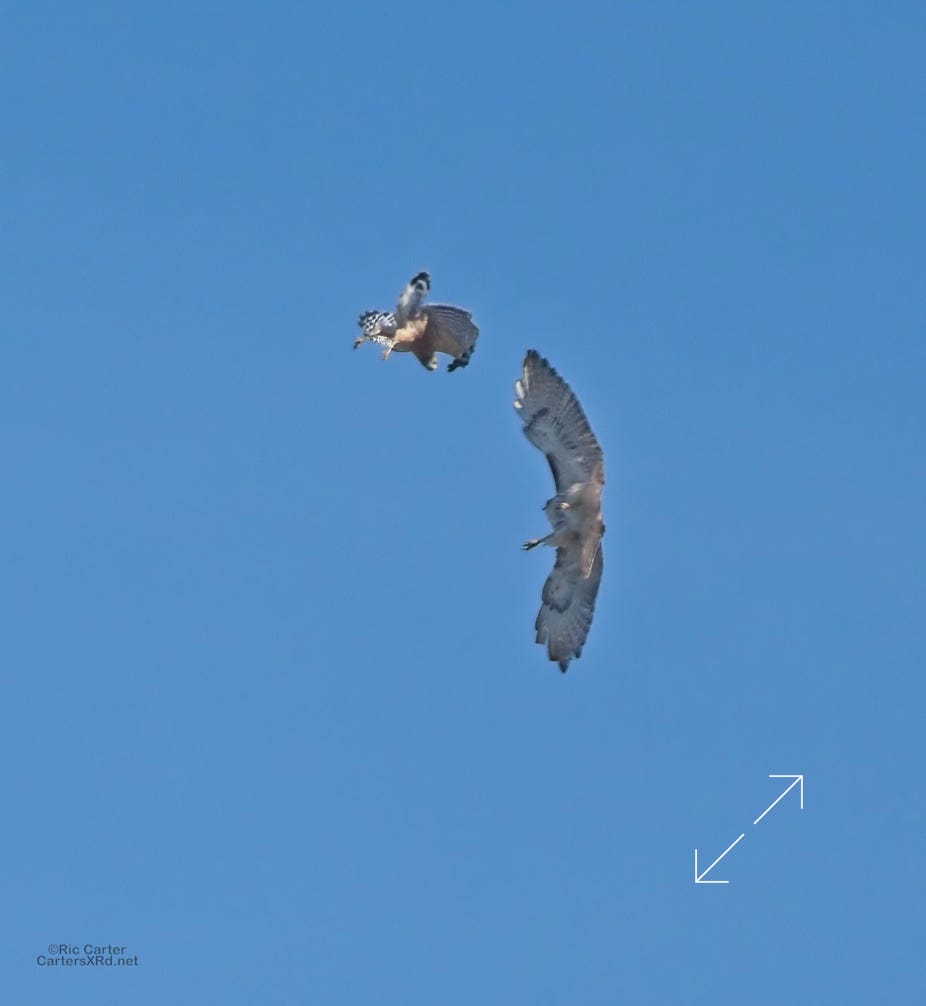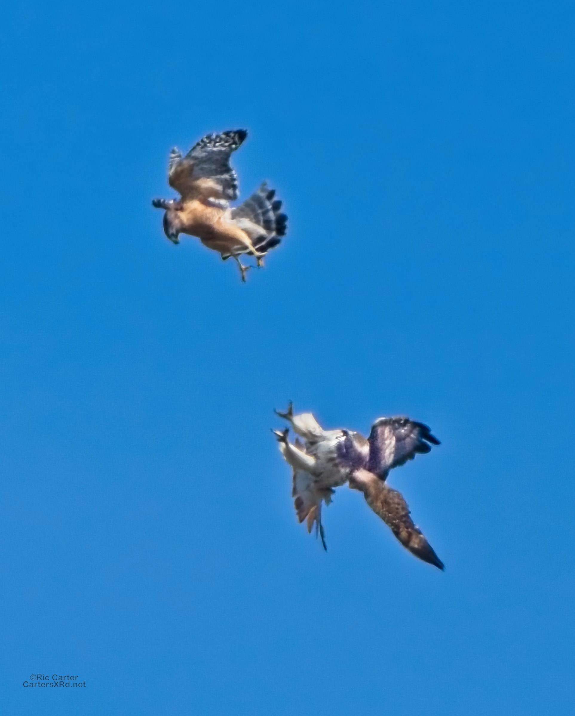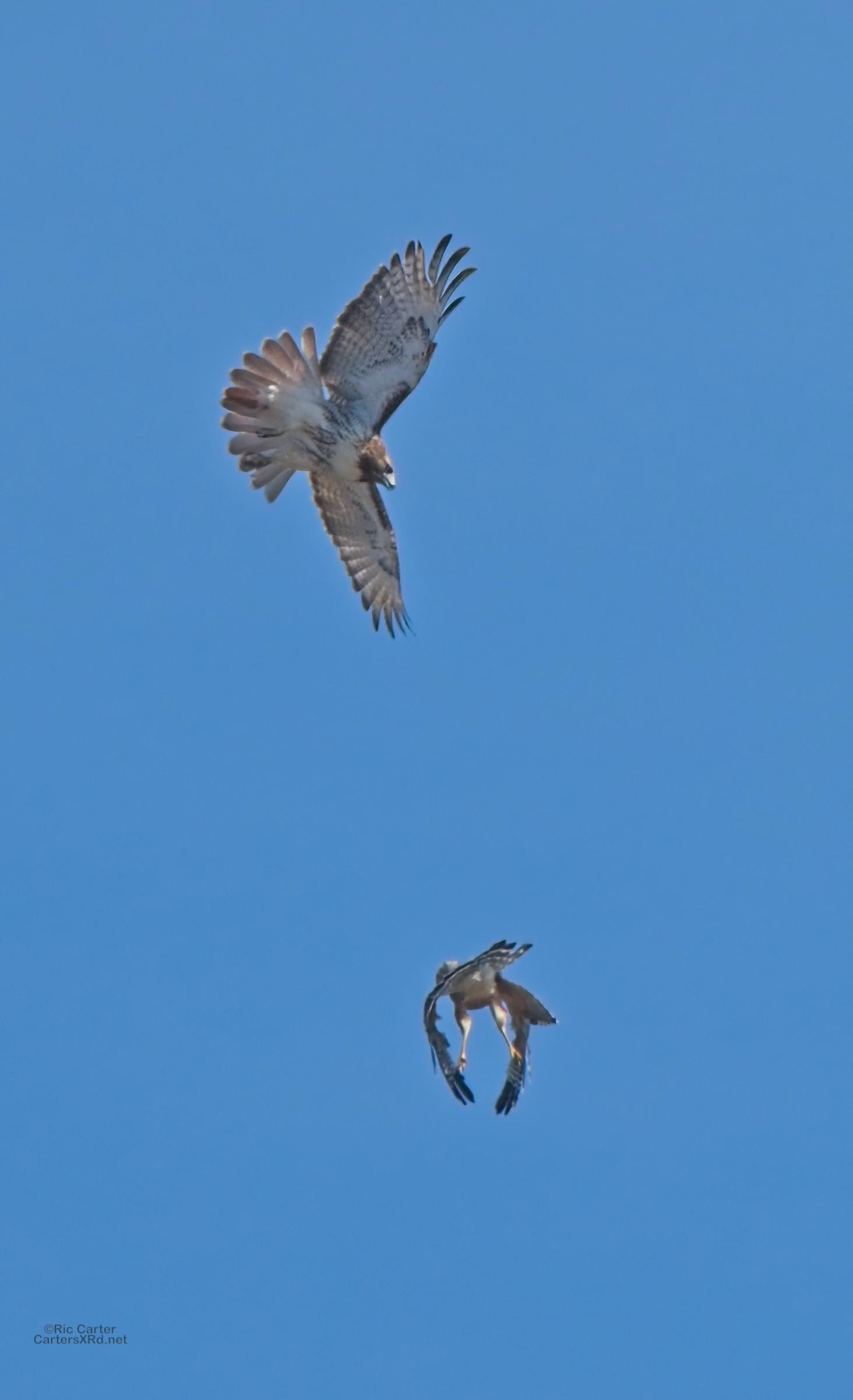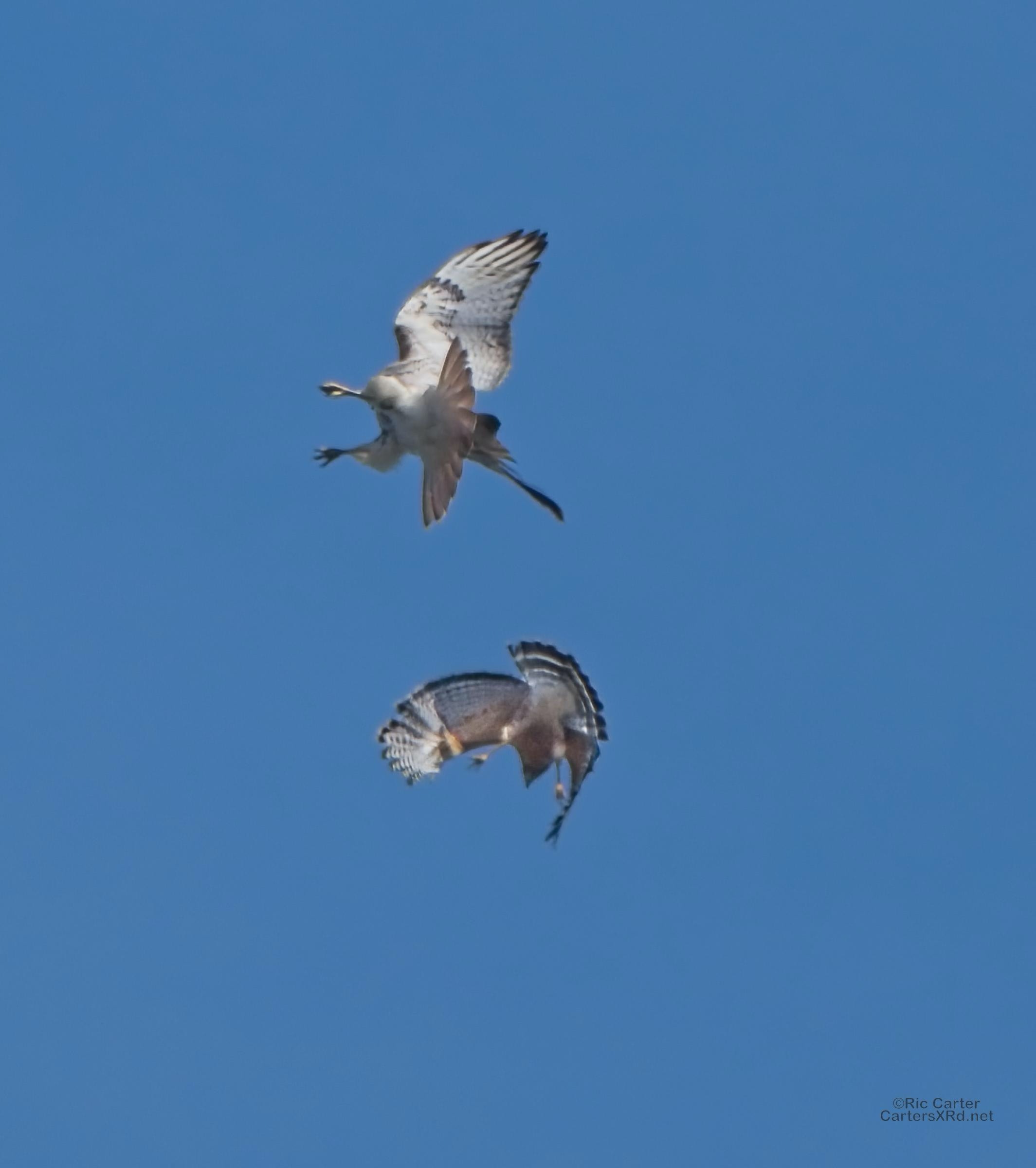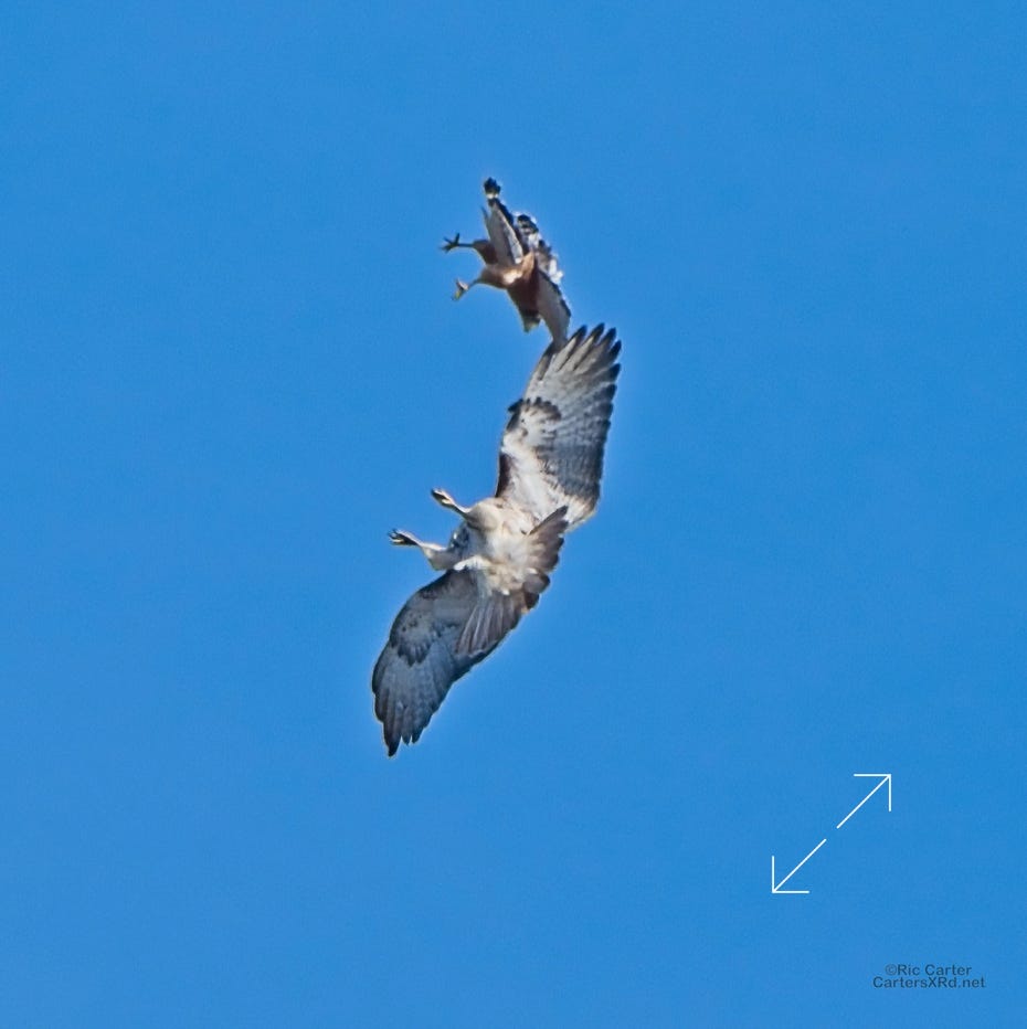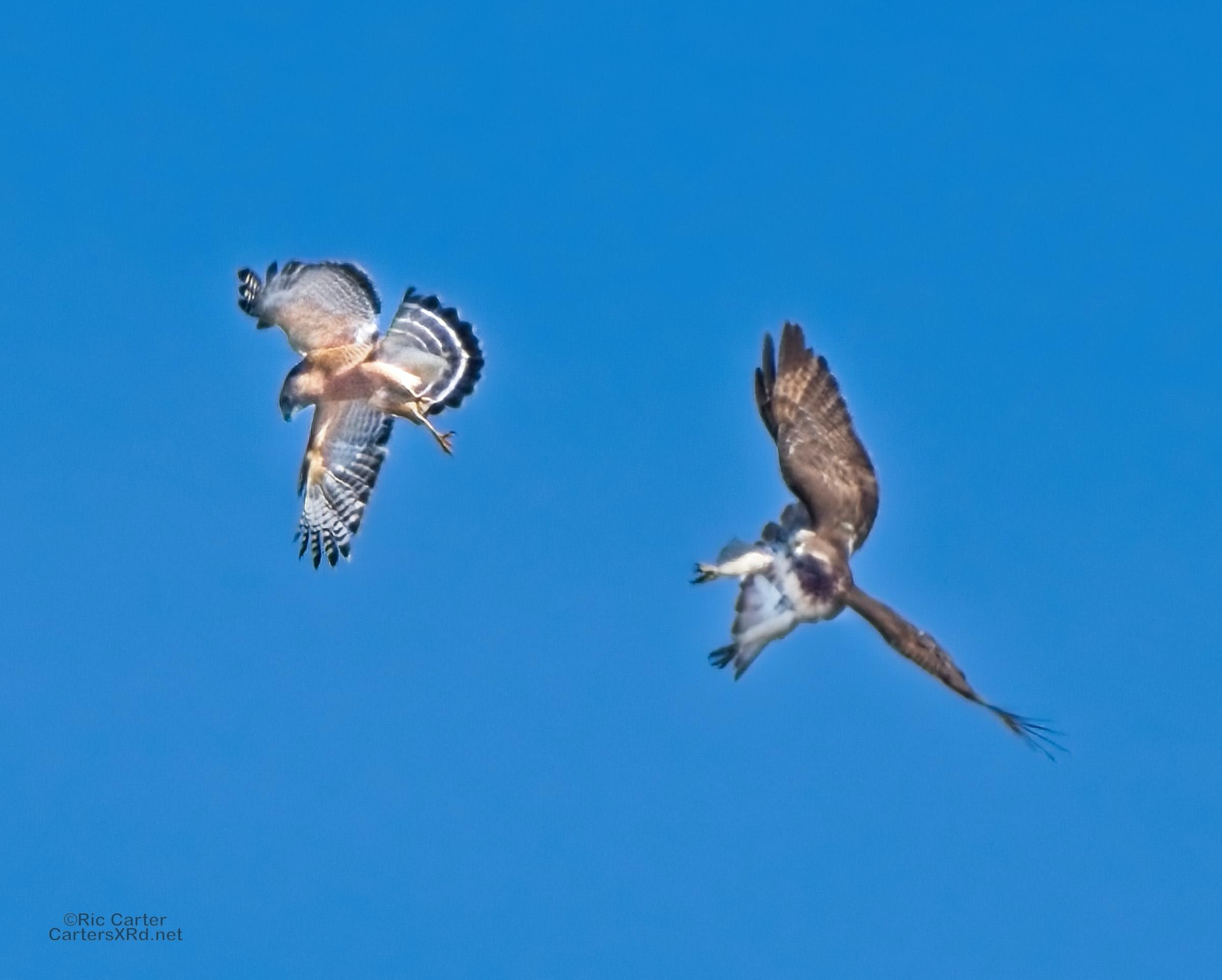 I was going to practice drone flying the other day. As I stopped the car and was getting unpacked, I noticed a low flying red-tailed hawk headed toward me. I immediately decided not to fly drone (you just DO NOT fly drones around birds) and grabbed the telephoto in hopes of getting a few pictures of him (see Birds of Prey Week 6). He was not far past me when I heard a hawk cry. It was not him. There was a red-shouldered hawk approaching from the opposite direction. They were clearly working out the open field territory dominance there. I expect they will be taking turns as they have for the last few years. I wish these were sharper, but the action takes place 500-900 meters away and I had to work hand-held.