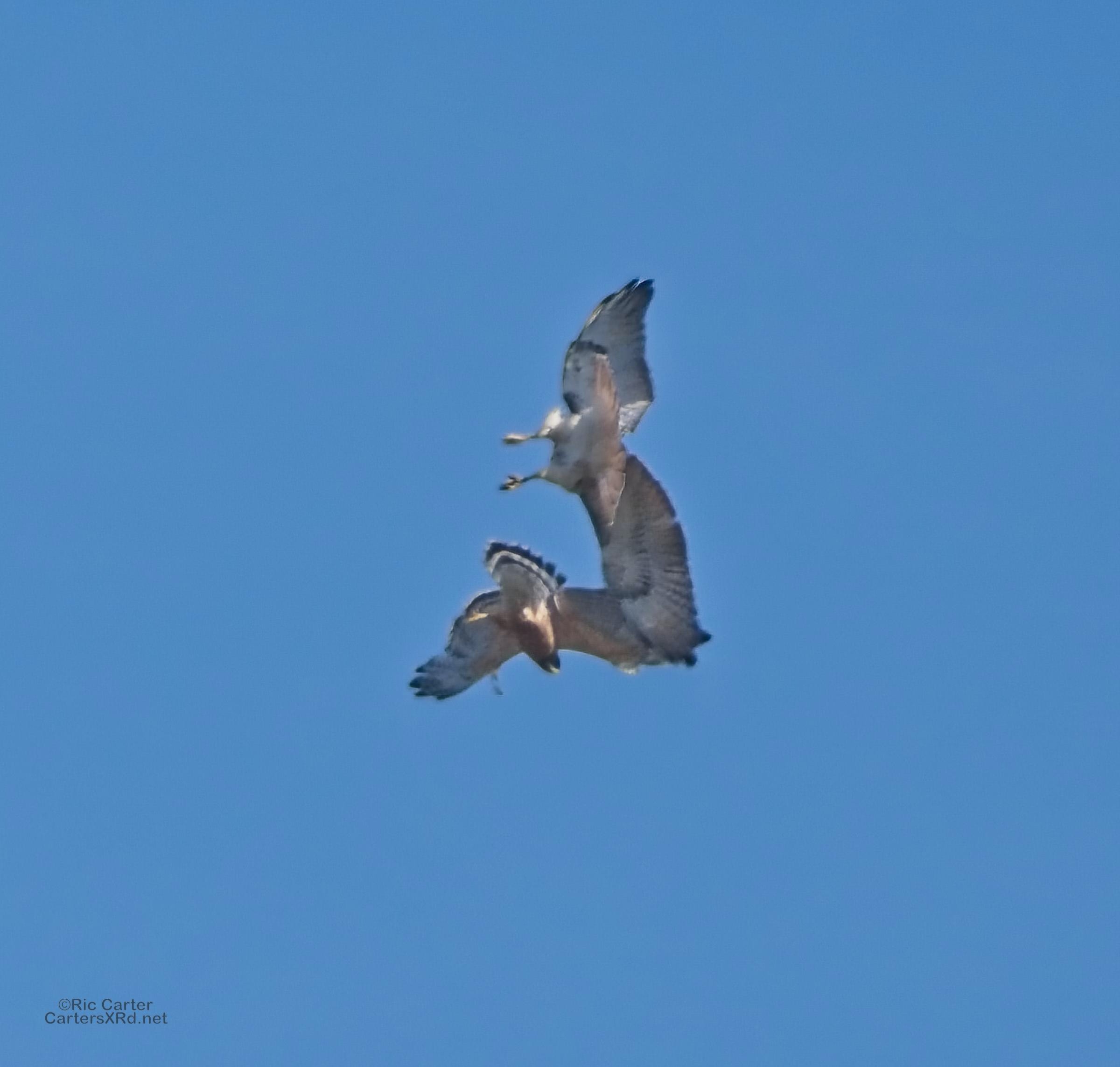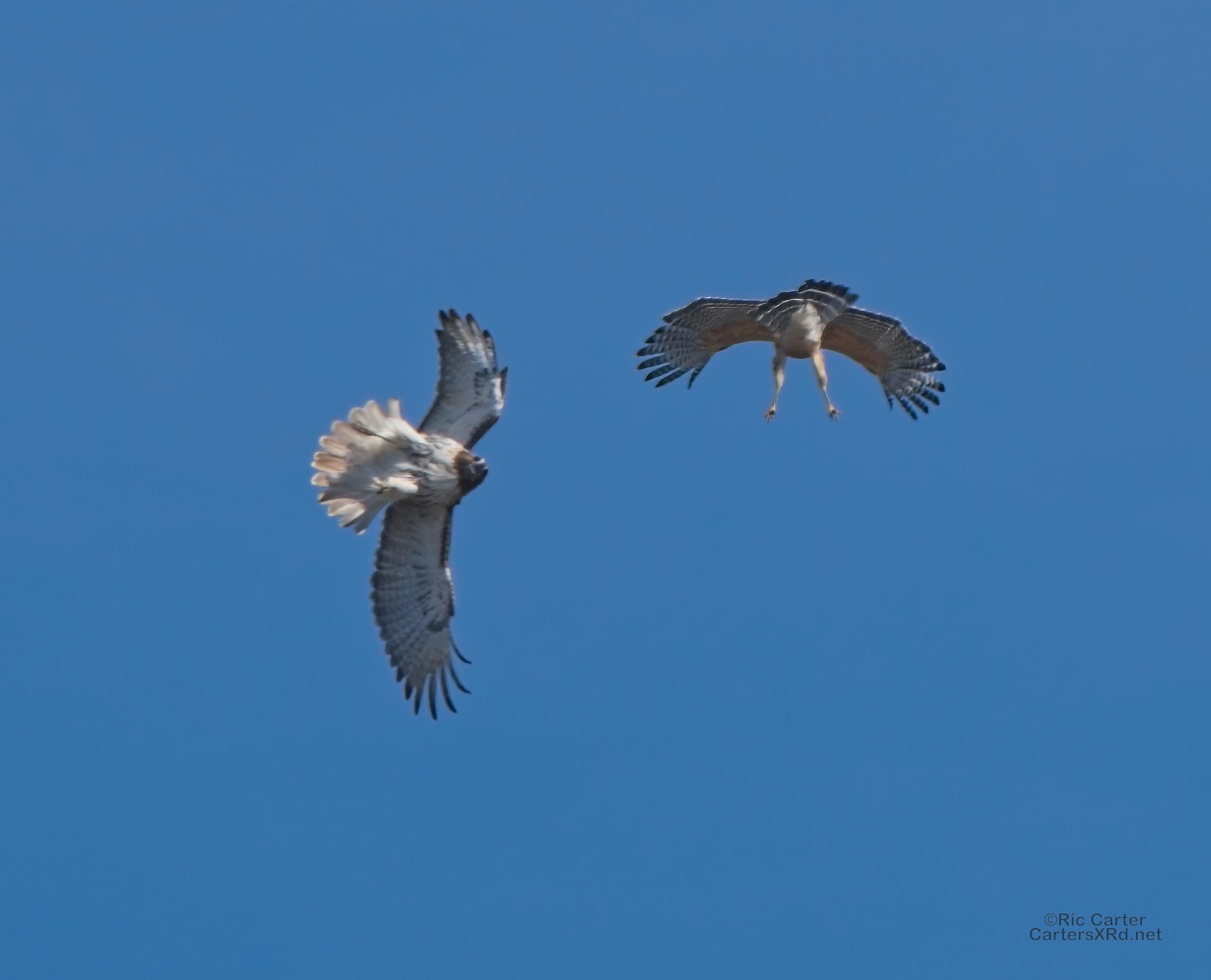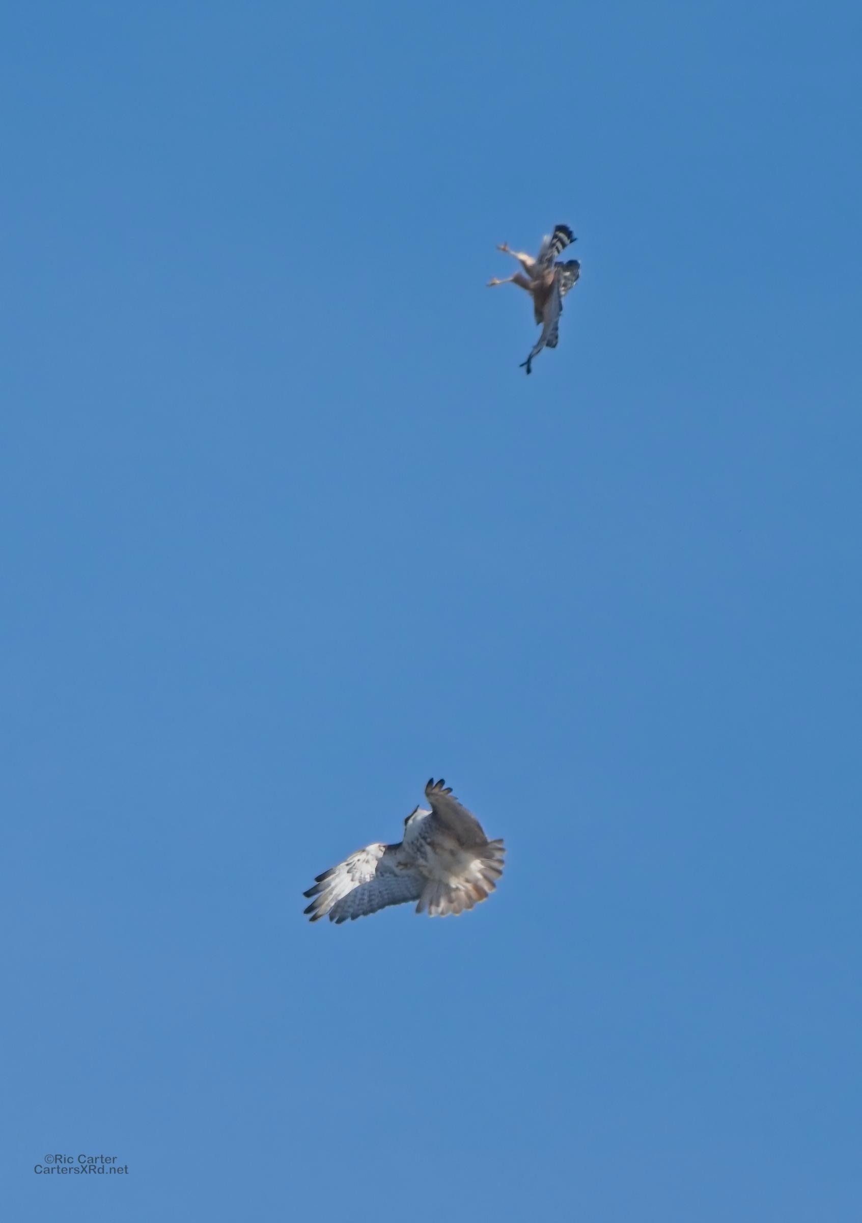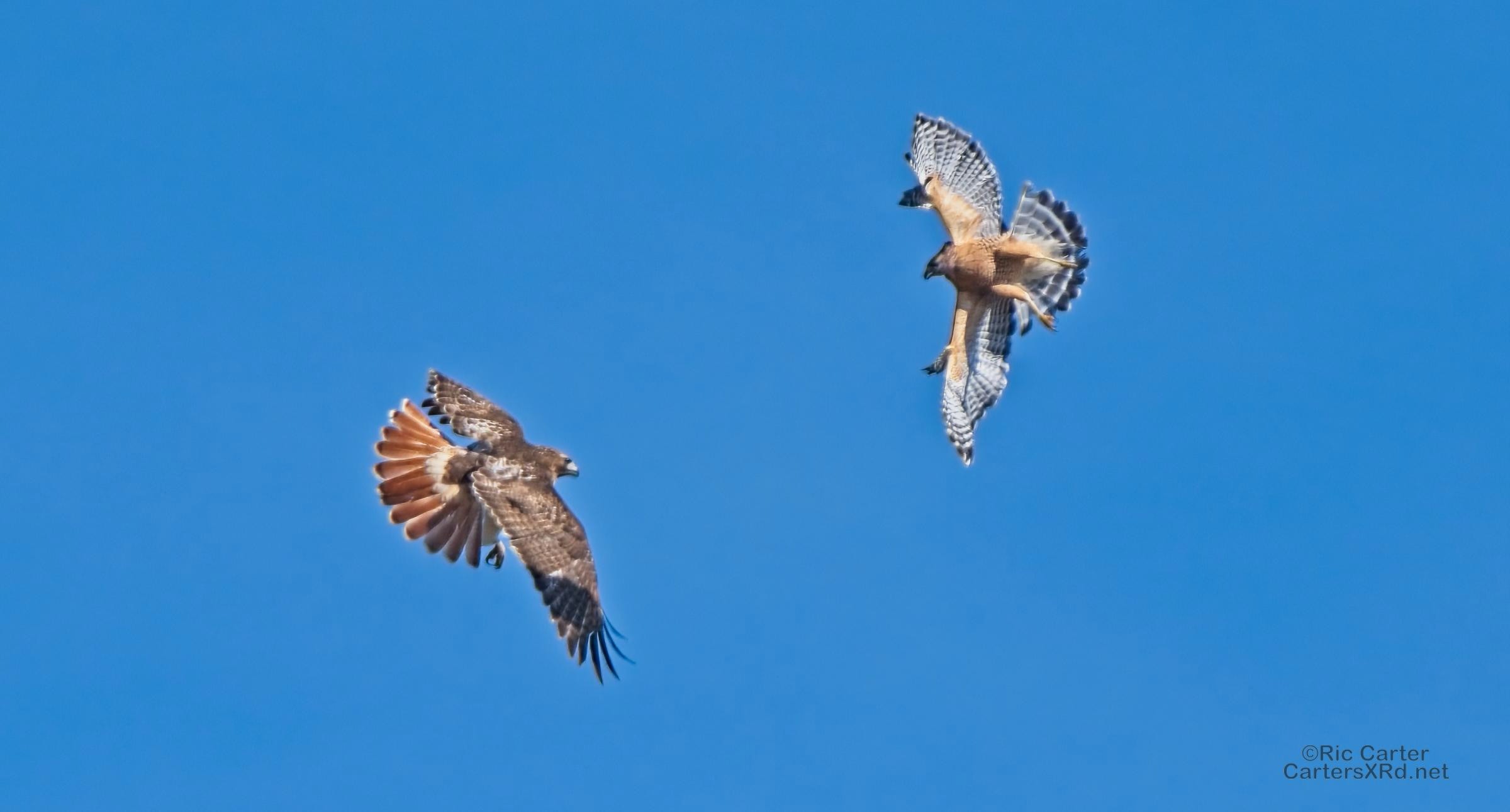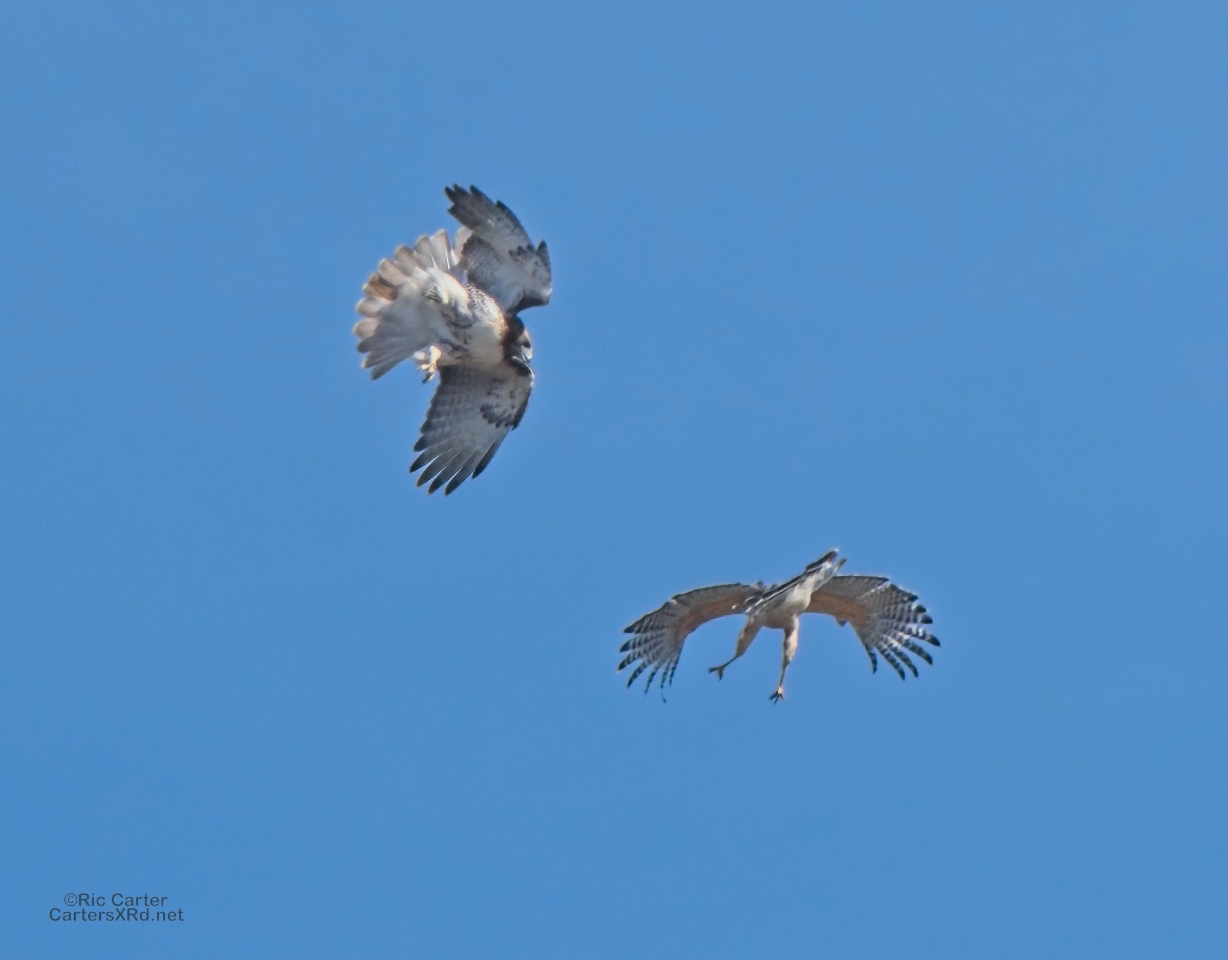 I was going to practice drone flying the other day. As I stopped the car and was getting unpacked, I noticed a low flying red-tailed hawk headed toward me. I immediately decided not to fly drone (you just DO NOT fly drones around birds) and grabbed the telephoto in hopes of getting a few pictures of him (see Birds of Prey Week 6). He was not far past me when I heard a hawk cry. It was not him. There was a red-shouldered hawk approaching from the opposite direction. They were clearly working out the open field territory dominance there. I expect they will be taking turns as they have for the last few years. I wish these were sharper, but the action takes place 500-900 meters away and I had to work hand-held.