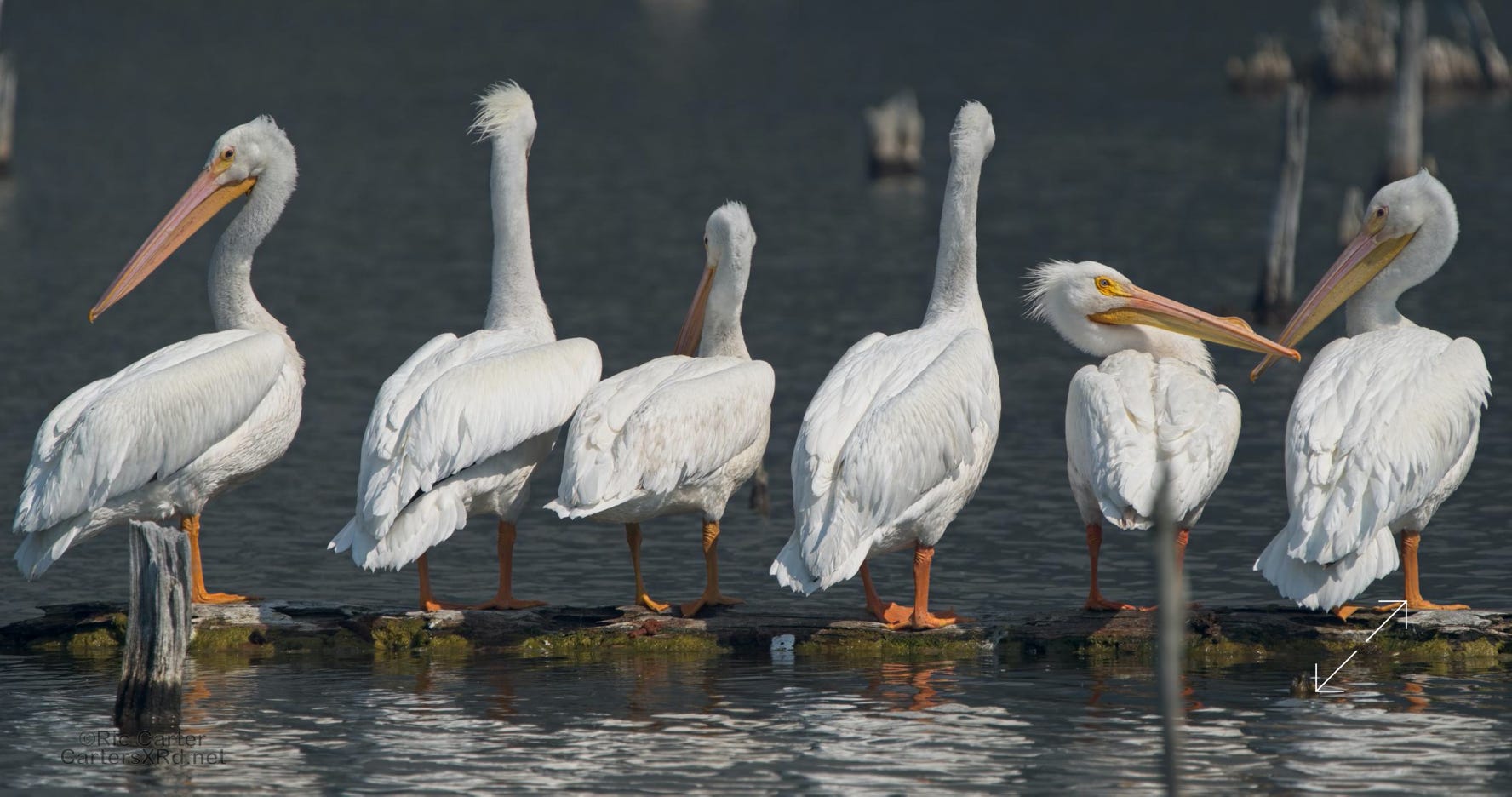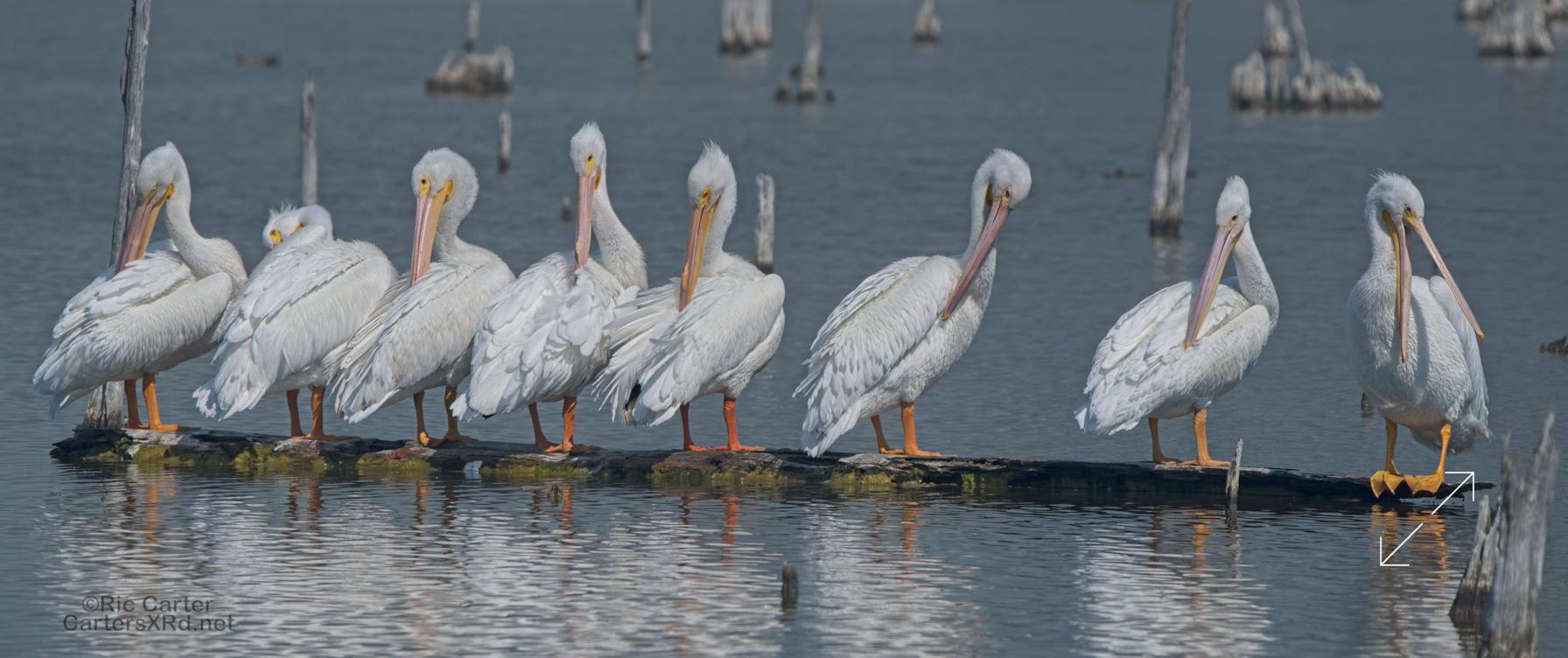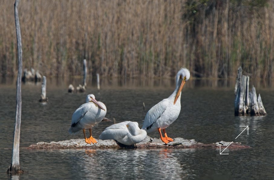 The white pelican is regular, but rare visitor to the Pamlico Sound area. They are really huge birds, weighing in at more than 15 pounds, twice as heavy as the more common brown pelican, and with a wingspan nearly three feet wider than the bald eagle. These guys were in the impoundment near the foot of the Hobucken Bridge. I took these March 16, 2023.