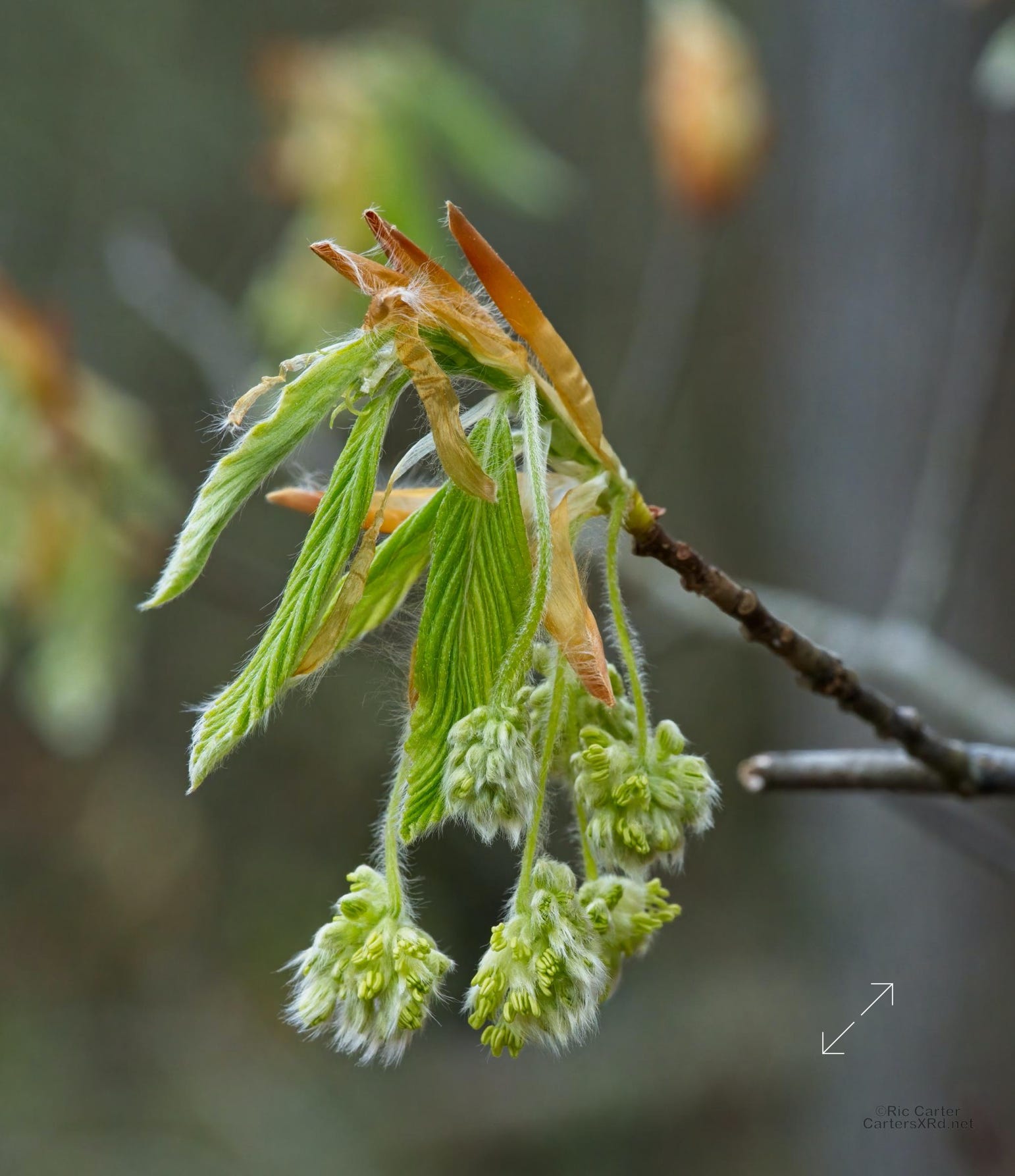 Several trees have interesting flowers. This is the beech which are blooming now.