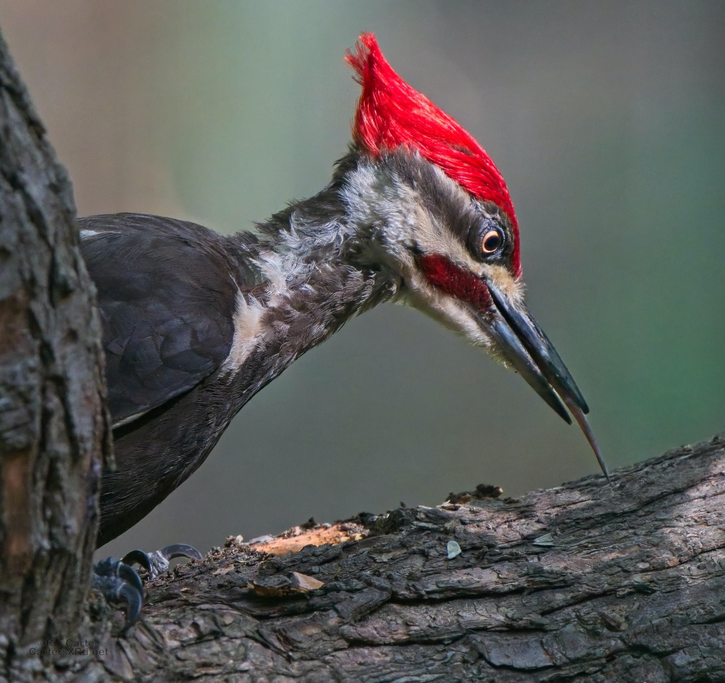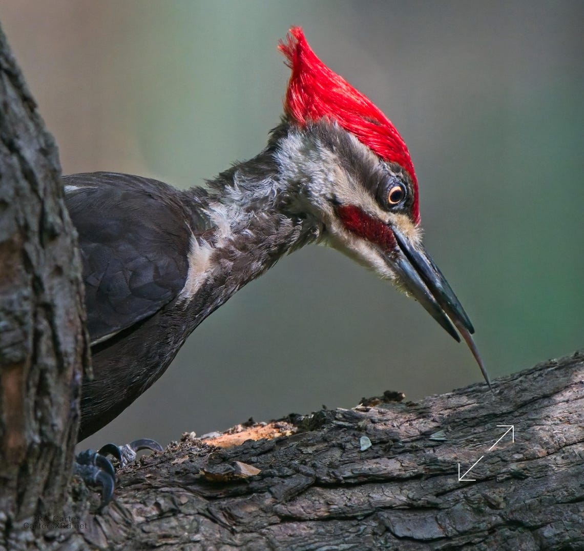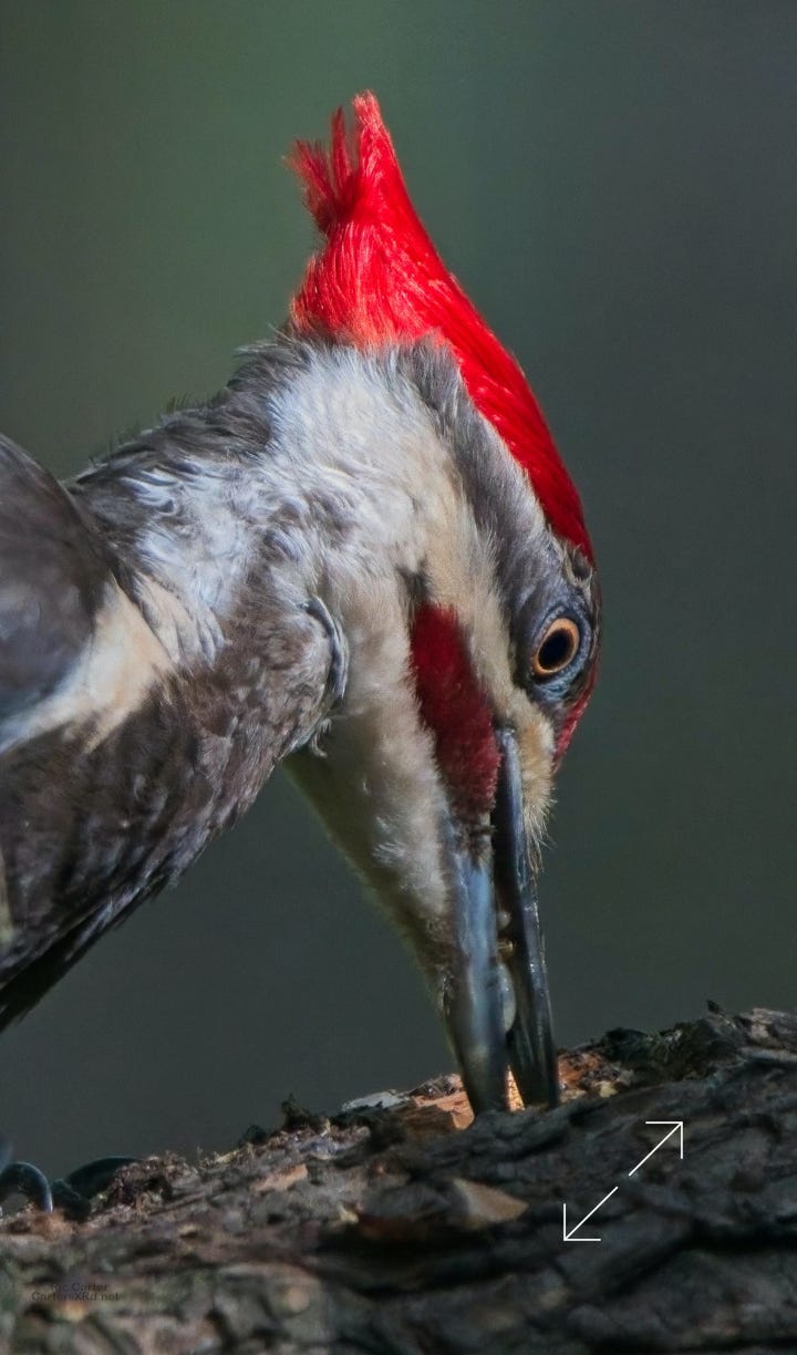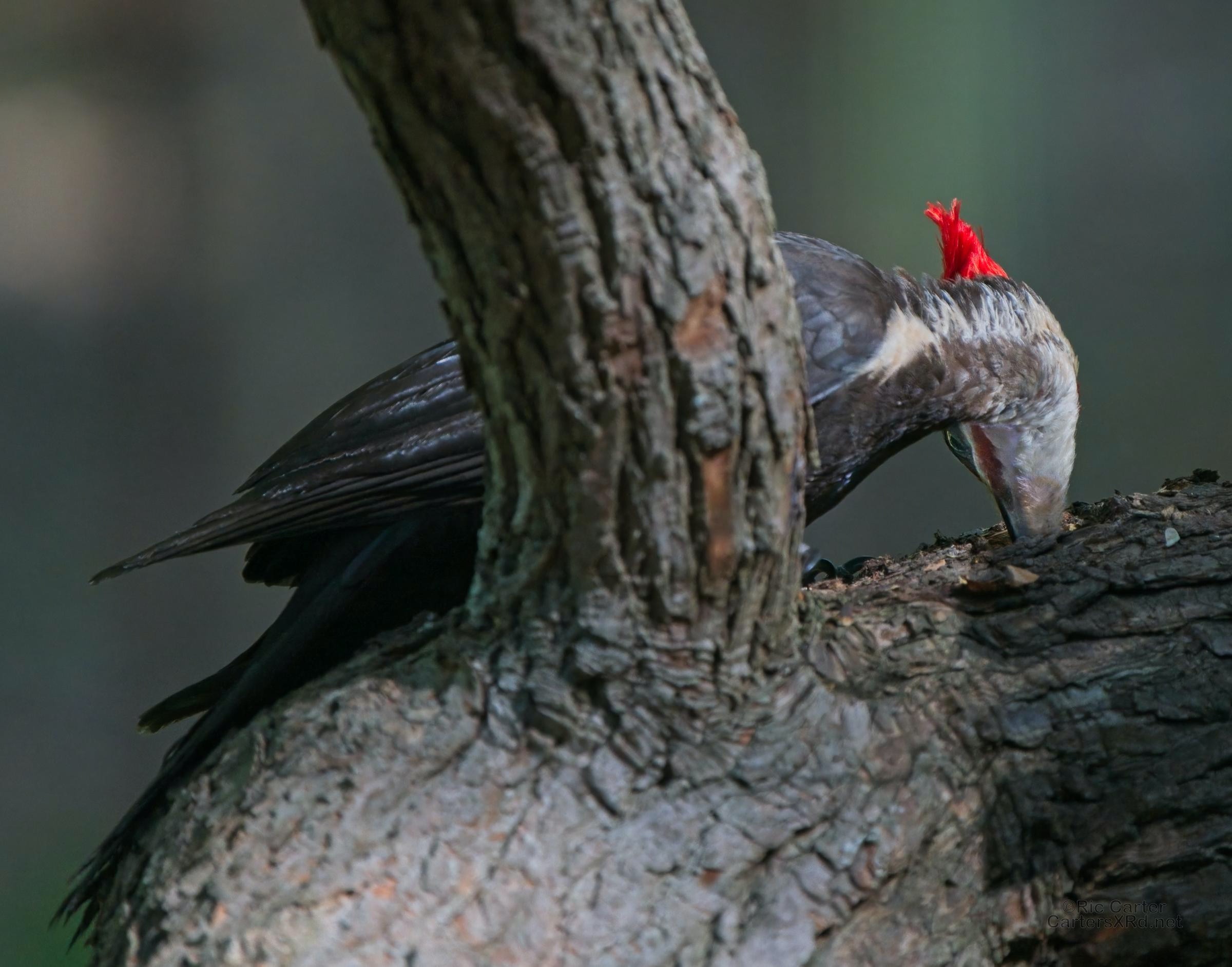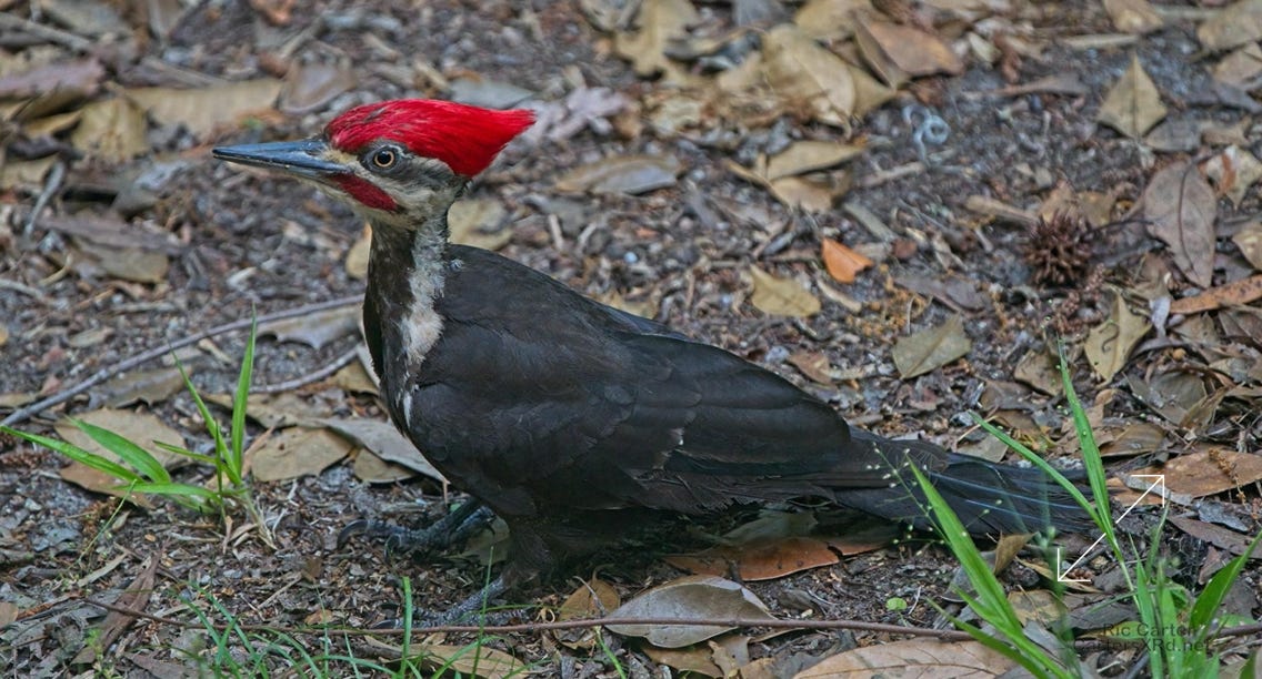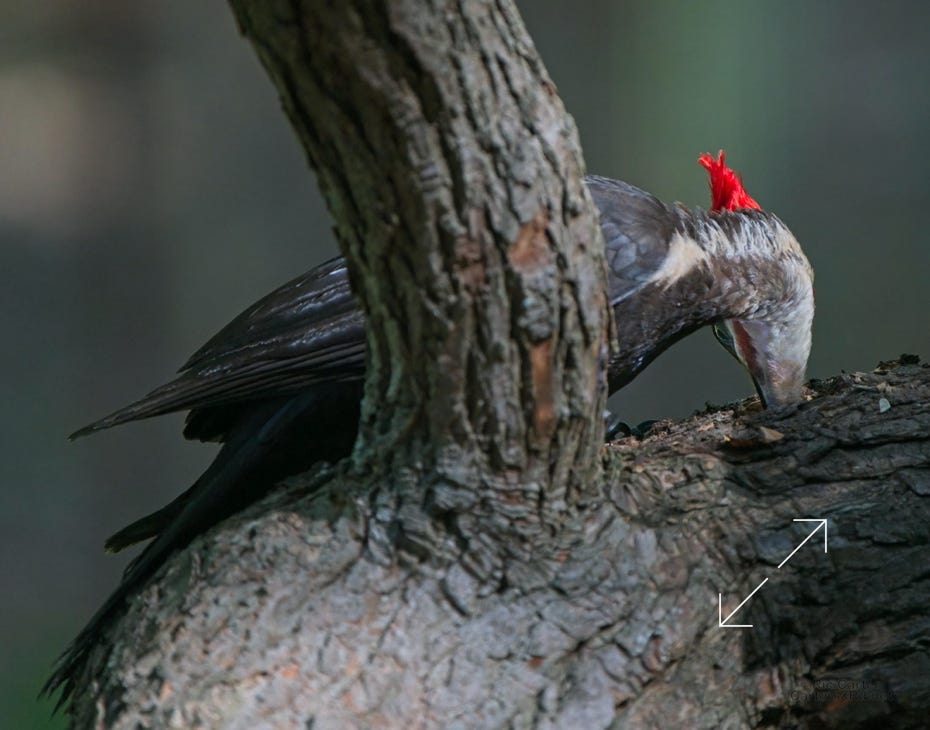 One day last week a very kind, and maybe a bit vain, pileated woodpecker came by to help root the bugs out of one of the old sassafrases in the yard. At top right, you can see a grub in his mouth.