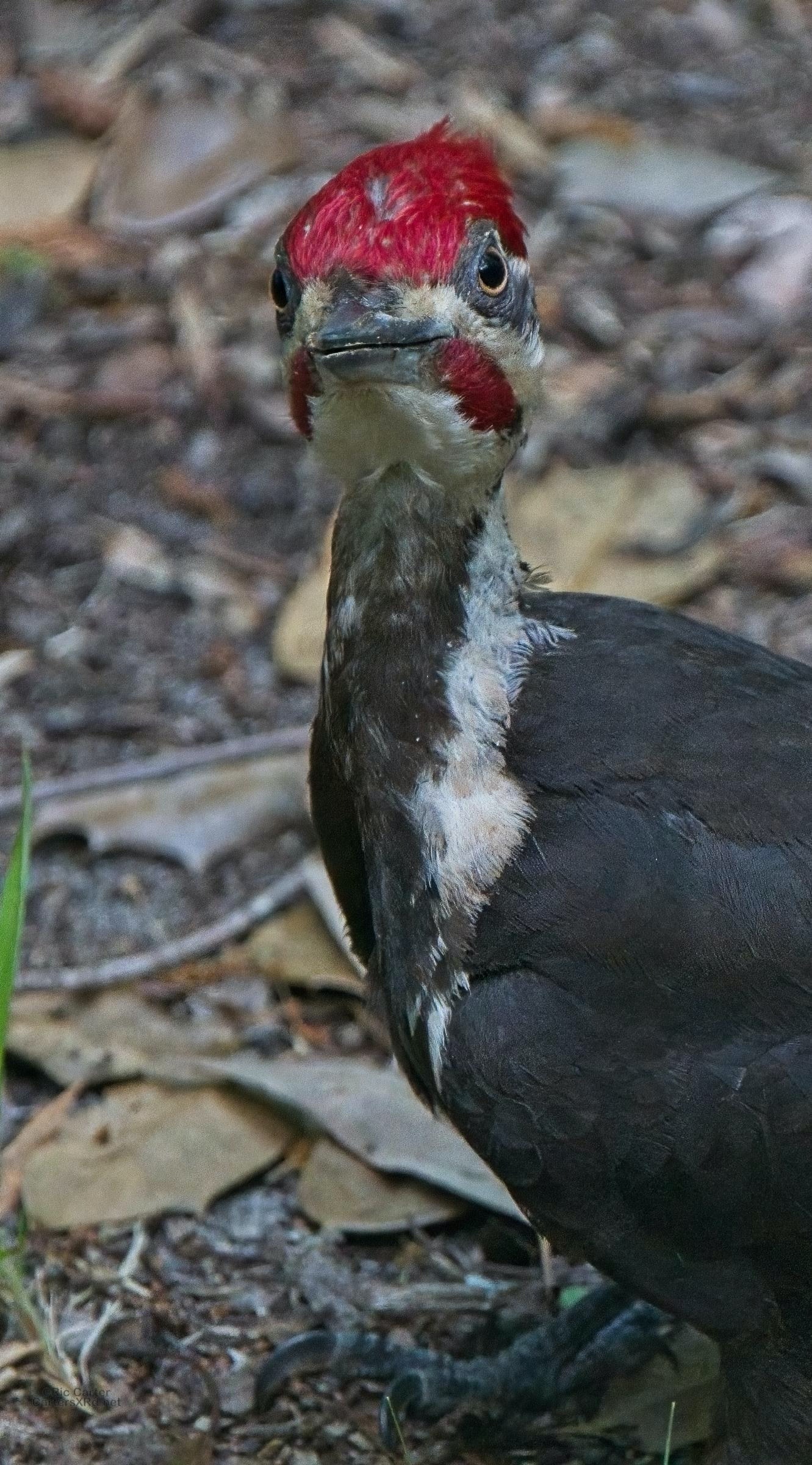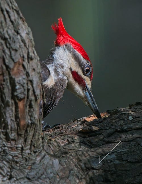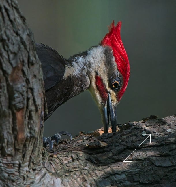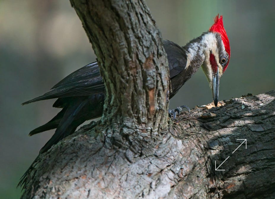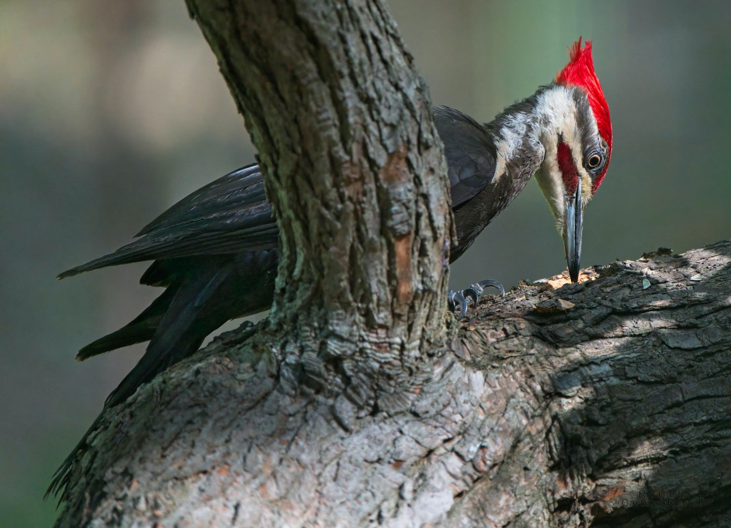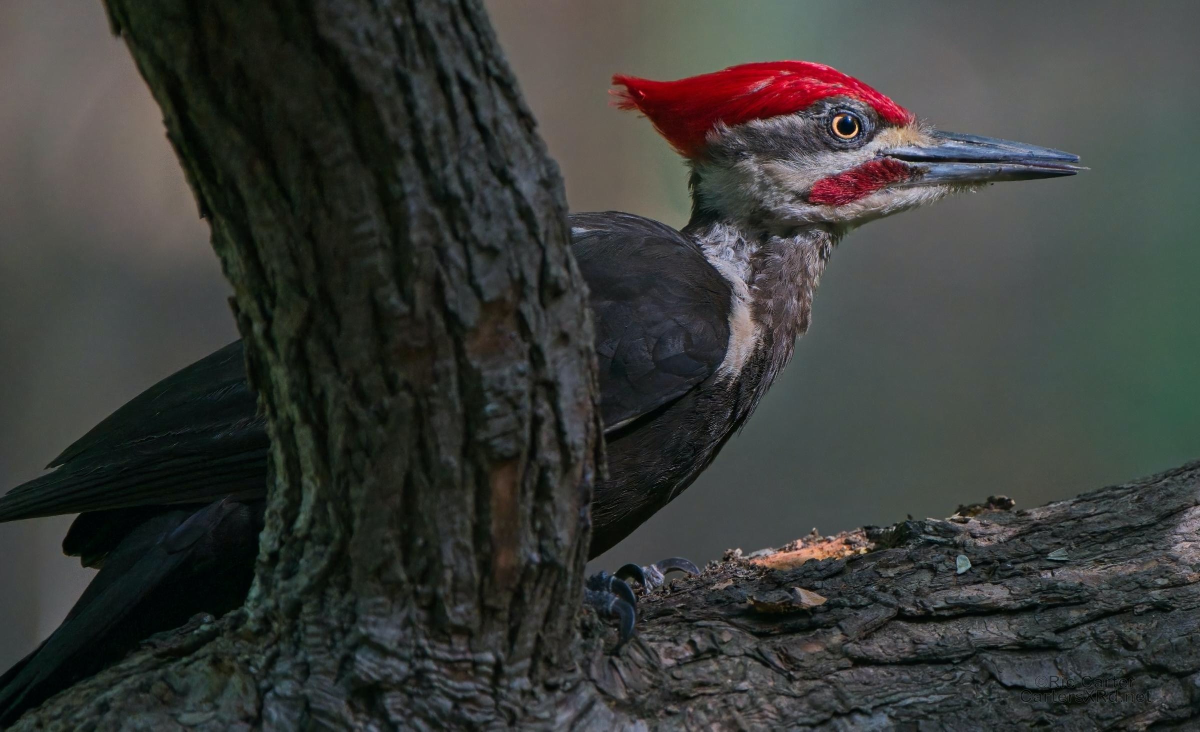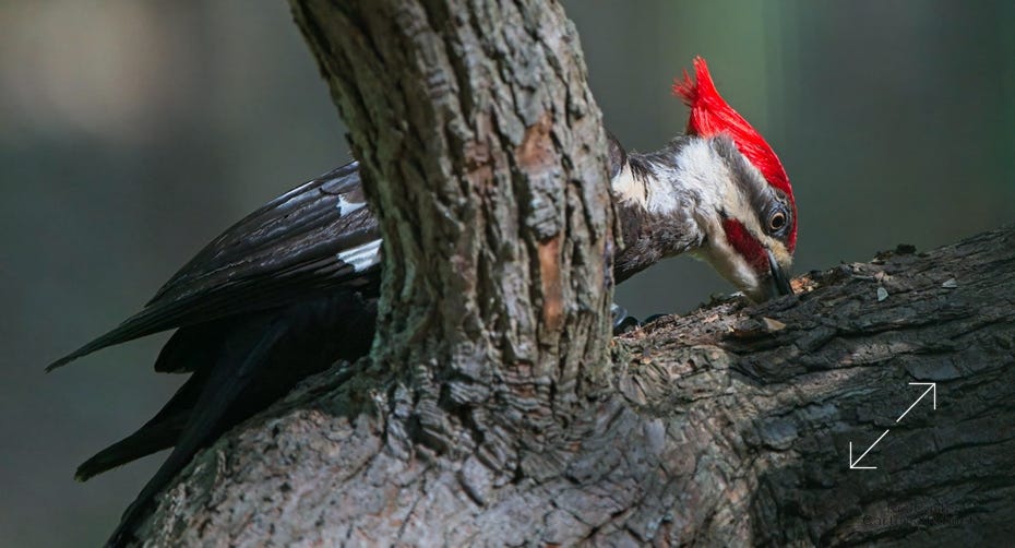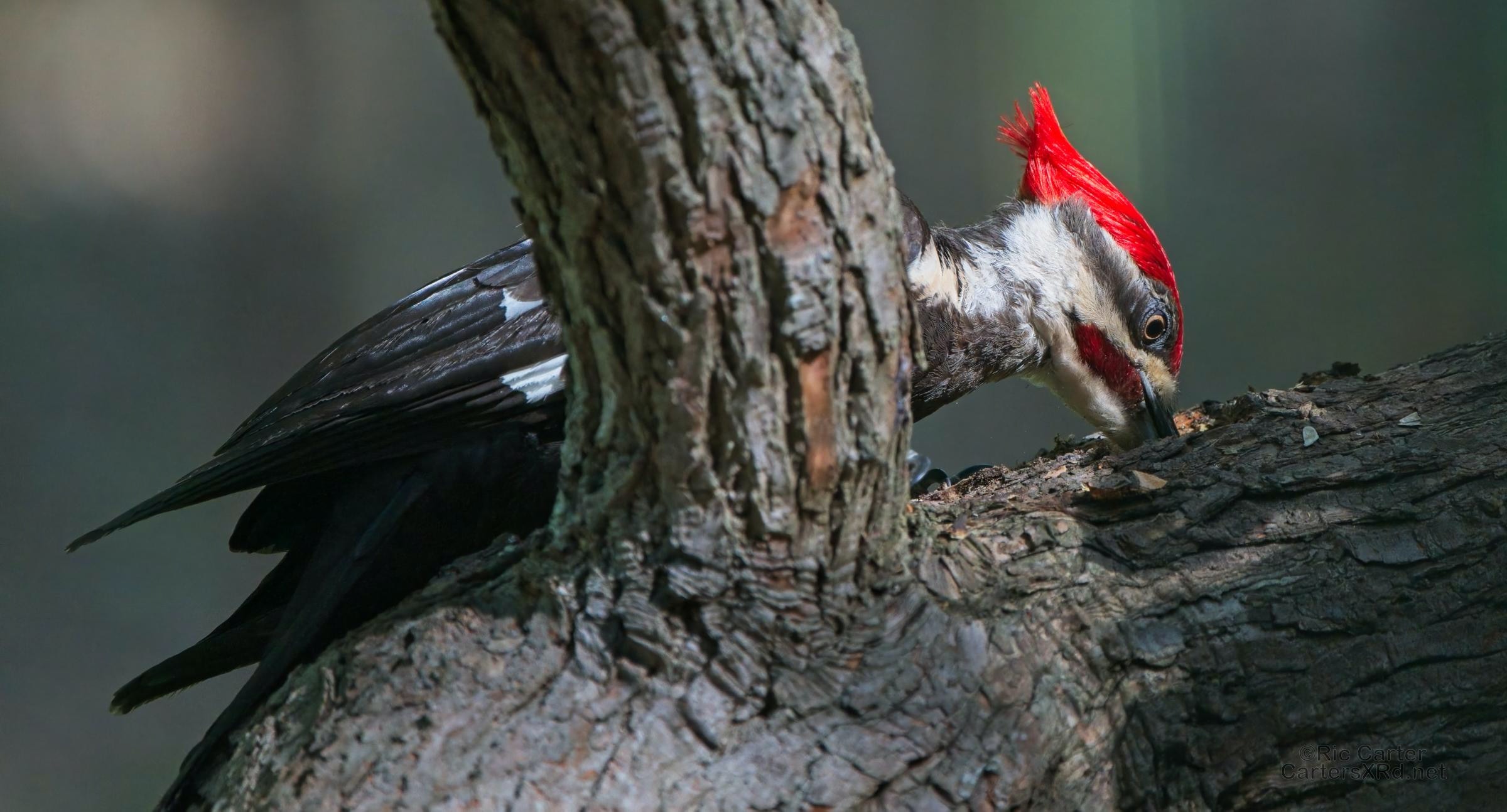 One day last week a very kind, and maybe a bit vain, pileated woodpecker came by to help root the bugs out of one of the old sassafrases in the yard. At top right, you can see a grub in his mouth.