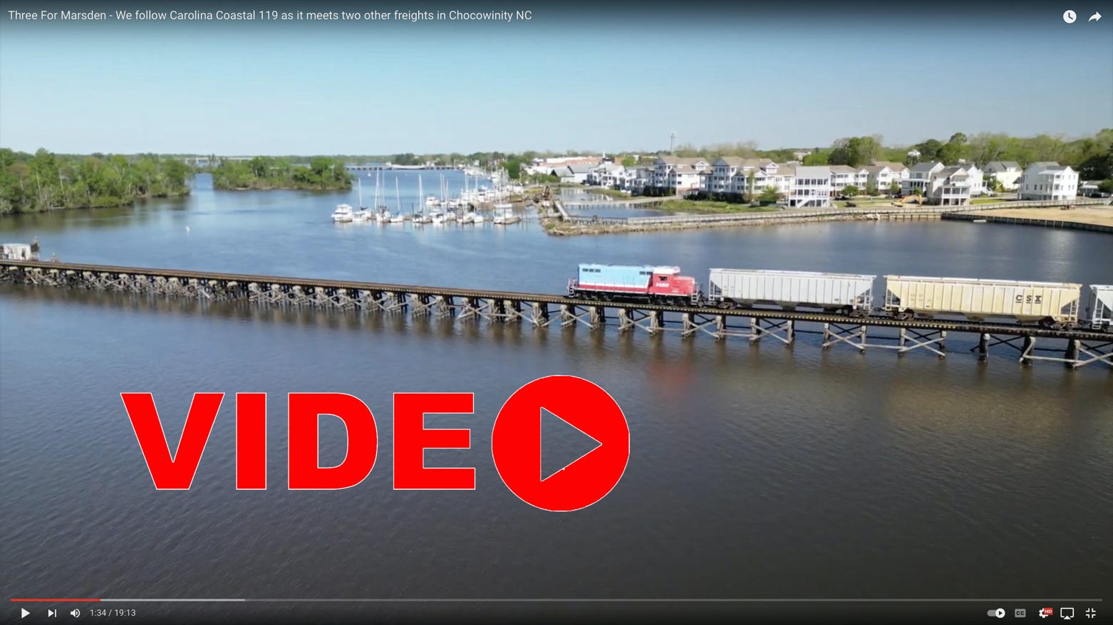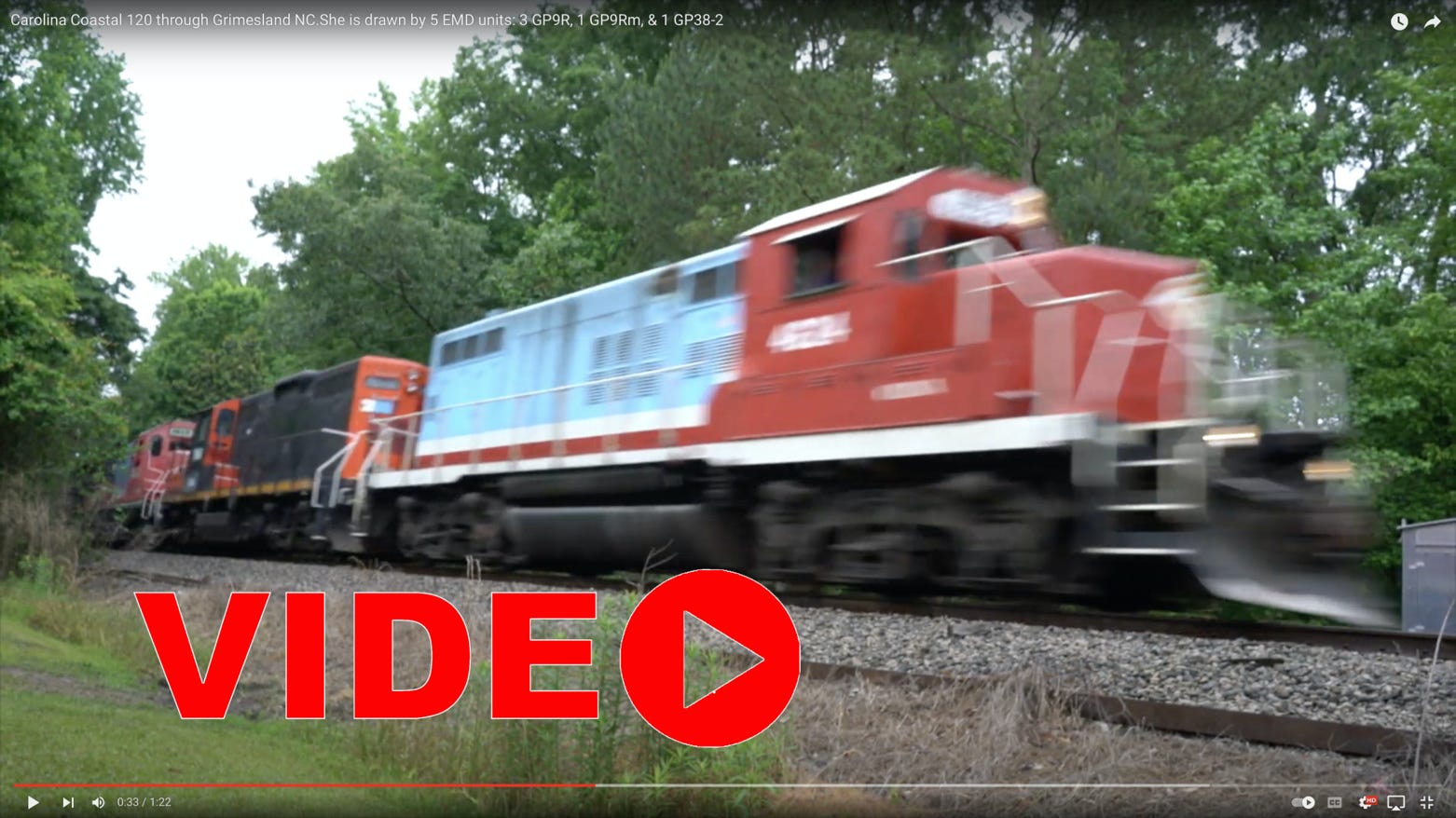 The first video here shows Marsden Yard i Chocowinity at its fullest - three trains CLNA 119, 120, and Norfolk Southern P90. It starts with 119 crossing the river headed toward Choco. The second is CLNA 120 with FIVE power units pulling - four GP9 variations and a GP38-2 passing through Grimesland on the way back to Wilson.