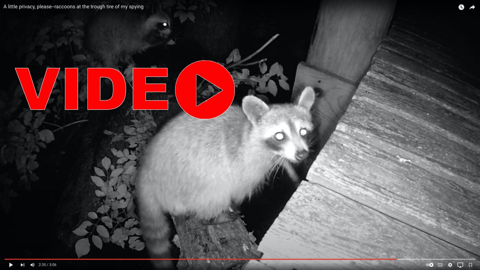 We have several raccoon regulars at Kitty’s Swampy Cafe where we drop scraps. It seems to keep them off the deck and out of the garbage. This night, they tired of the camera’s prying eye.