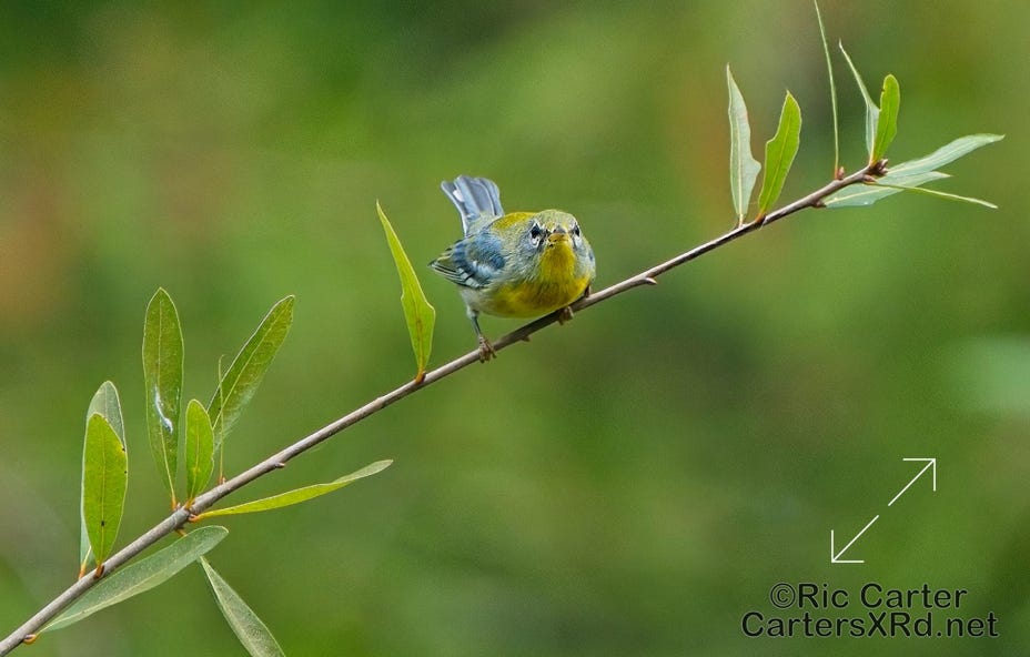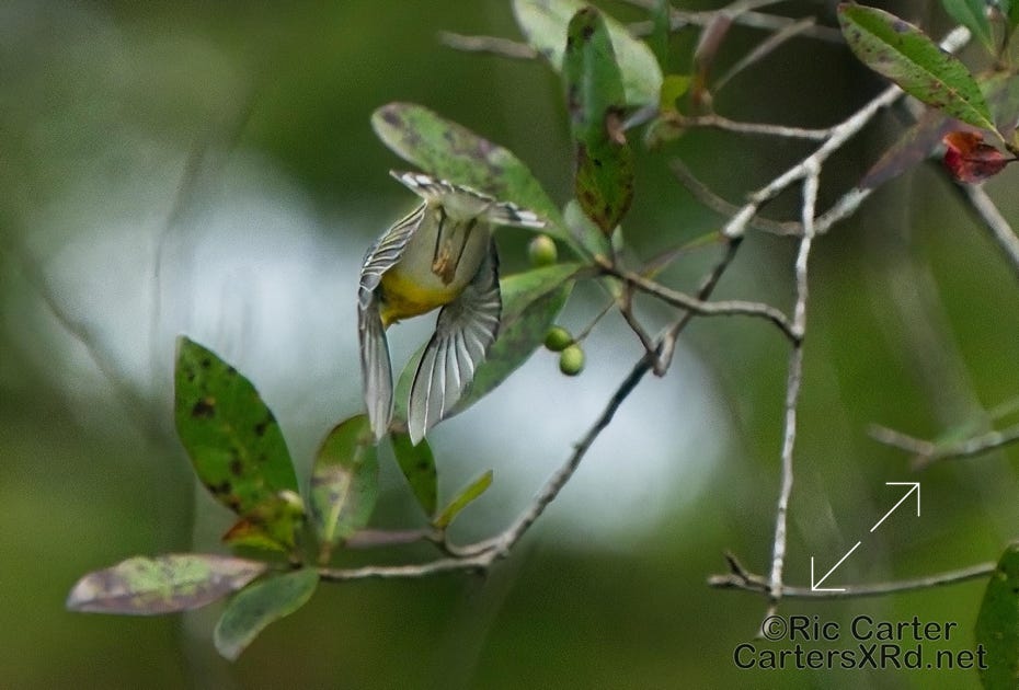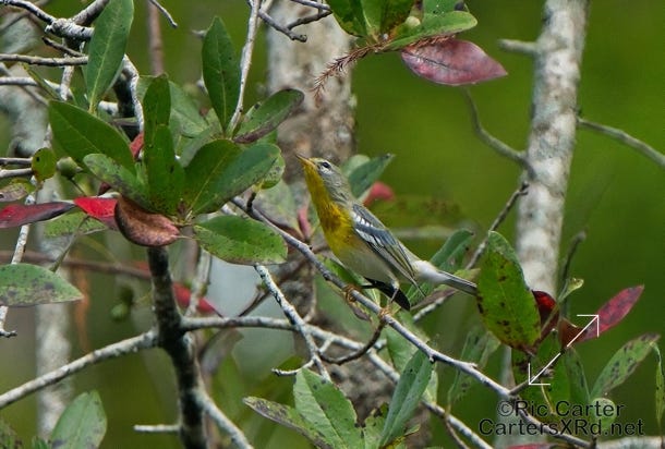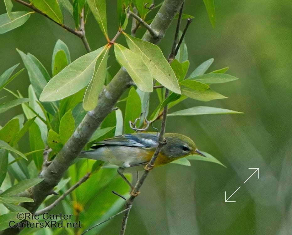 Caught some Northern Parulas up Bear Creek. This is the best I could do with those little jewels of the Spanish Moss as they prowled the swamp for insects. Week 38 was September 17-23, 2023.