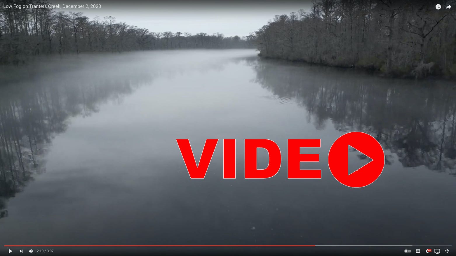 One of the prettiest weather events in the wetlands of the east is the low fog that creeps slowly up the rivers and creeks. They are often no more than five or six feet above the water surface. The fog laps against the shore line like some ghostly ocean seeking its old familiar shorelines. This one was crawling Tranters Creek in early December of 2023.